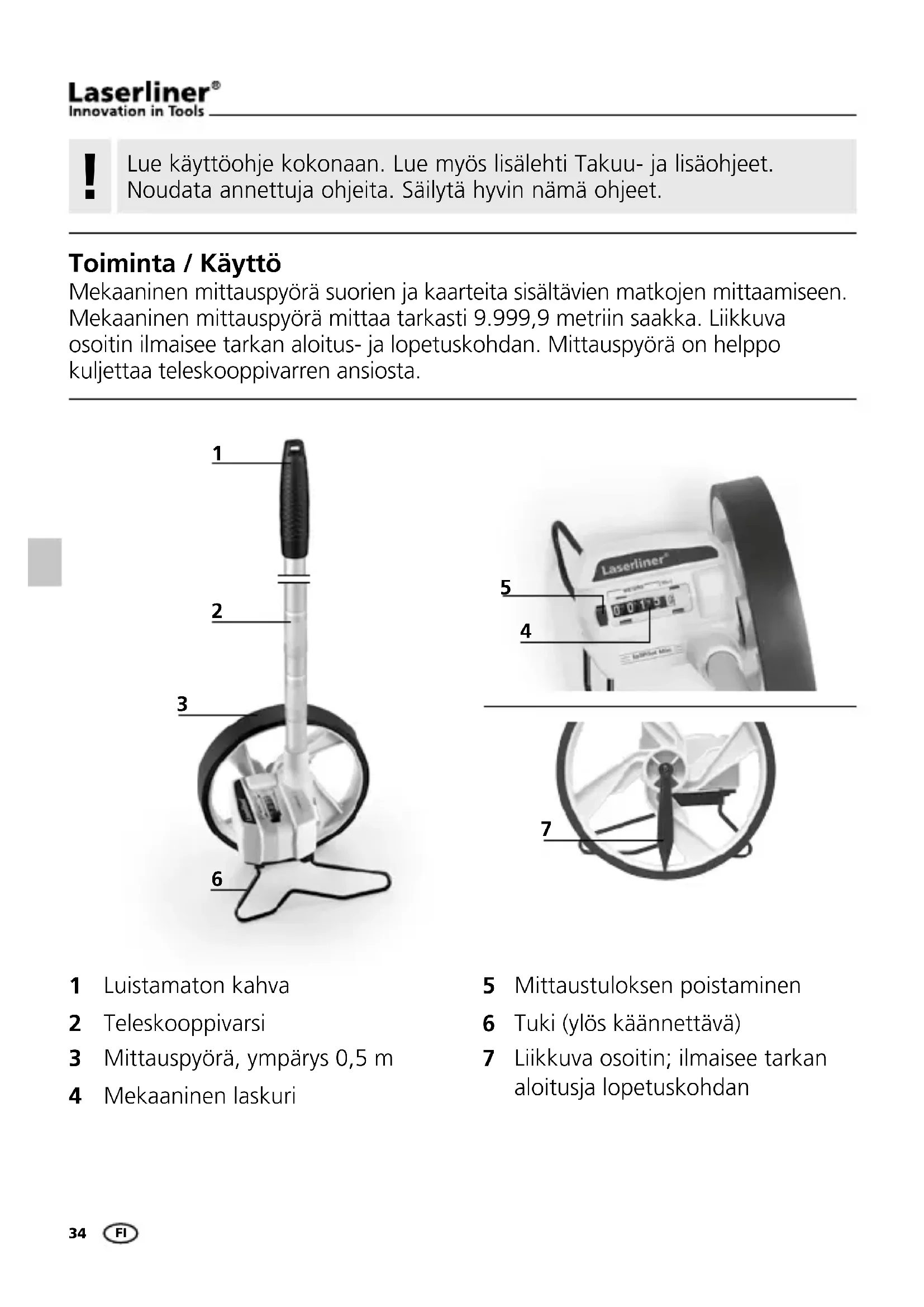 Toiminta / Käyttö Mekaaninen mittauspyörä suorien ja kaarteita sisältävien matkojen mittaamiseen. Mekaaninen mittauspyörä mittaa tarkasti 9.999,9 metriin saakka. Liikkuva osoitin ilmaisee tarkan aloitus- ja lopetuskohdan. Mittauspyörä on helppo kuljettaa teleskooppivarren ansiosta. Luistamaton kahva Teleskooppivarsi Mittauspyörä, ympärys 0,5 m Mekaaninen laskuri Mittaustuloksen poistaminen Tuki (ylös käännettävä) Liikkuva osoitin; ilmaisee tarkan aloitusja lopetuskohdan