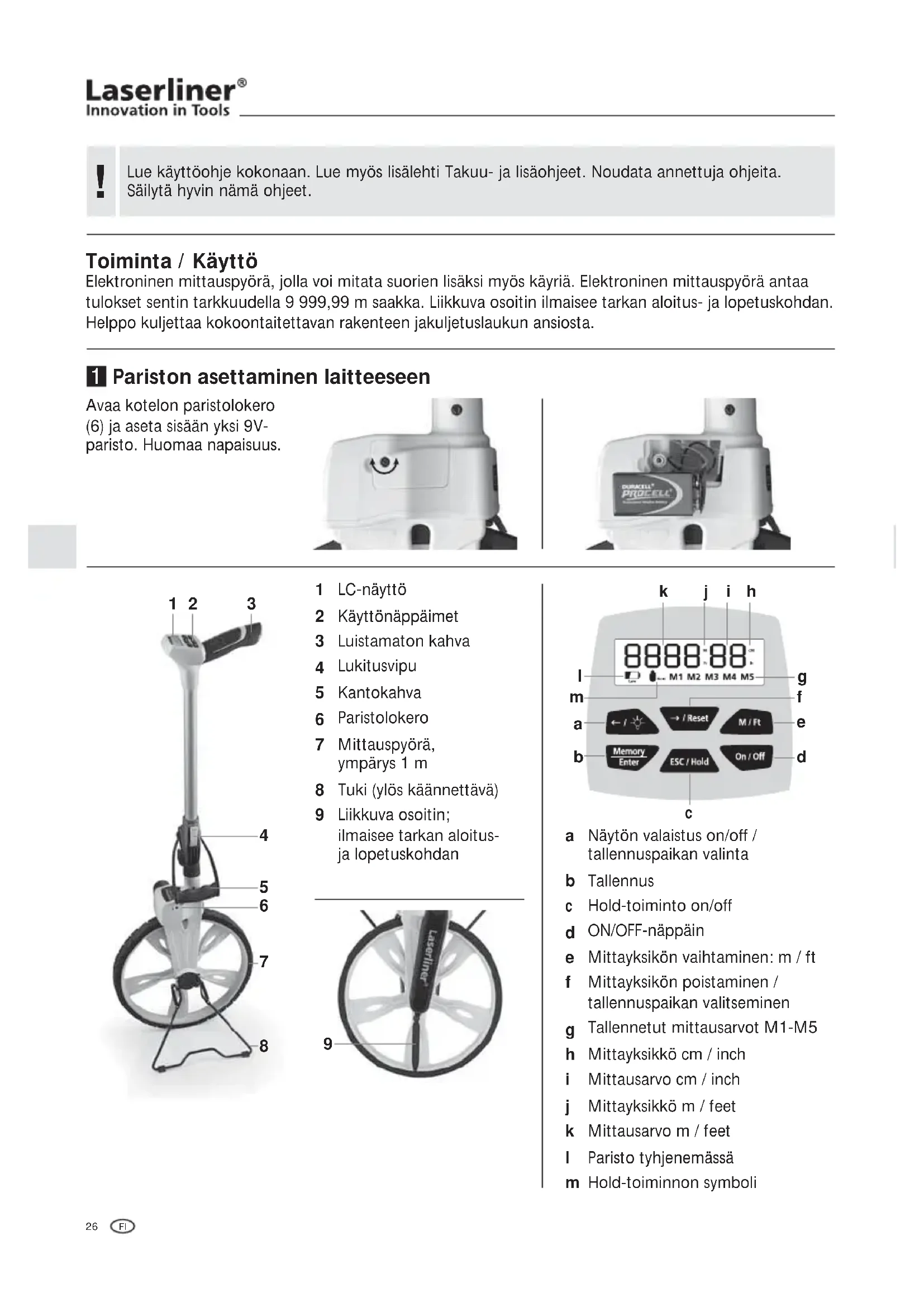 Toiminta / Käyttö Elektroninen mittauspyörä, jolla voi mitata suorien lisäksi myös käyriä. Elektroninen mittauspyörä antaa tulokset sentin tarkkuudella 9 999,99 m saakka. Liikkuva osoitin ilmaisee tarkan aloitus- ja lopetuskohdan. Helppo kuljettaa kokoontaitettavan rakenteen jakuljetuslaukun ansiosta. Avaa kotelon paristolokero (6) ja aseta sisään yksi 9V- paristo. Huomaa napaisuus. Pariston asettaminen laitteeseen LC-näyttö Käyttönäppäimet Luistamaton kahva Lukitusvipu Kantokahva Paristolokero Mittauspyörä, ympärys 1 m Tuki (ylös käännettävä) Liikkuva osoitin; ilmaisee tarkan aloitus- ja lopetuskohdan