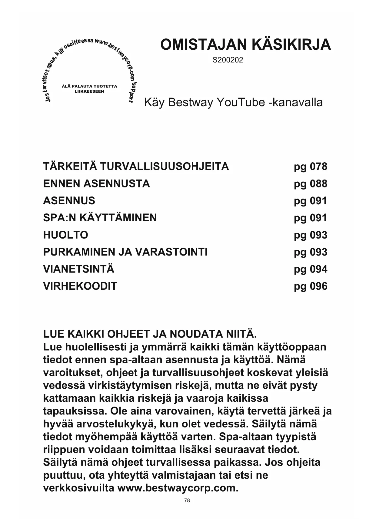 ÄLÄ PALAUTA TUOTETTALIIKKEESEENKYSYMYKSIÄ? ONGELMIA?OSIA PUUTTUU?Löydät usein kysyttyjä kysymyksiä, käyttöoppaitavideoita ja varosia osoitteessa bestwaycorp.com/support