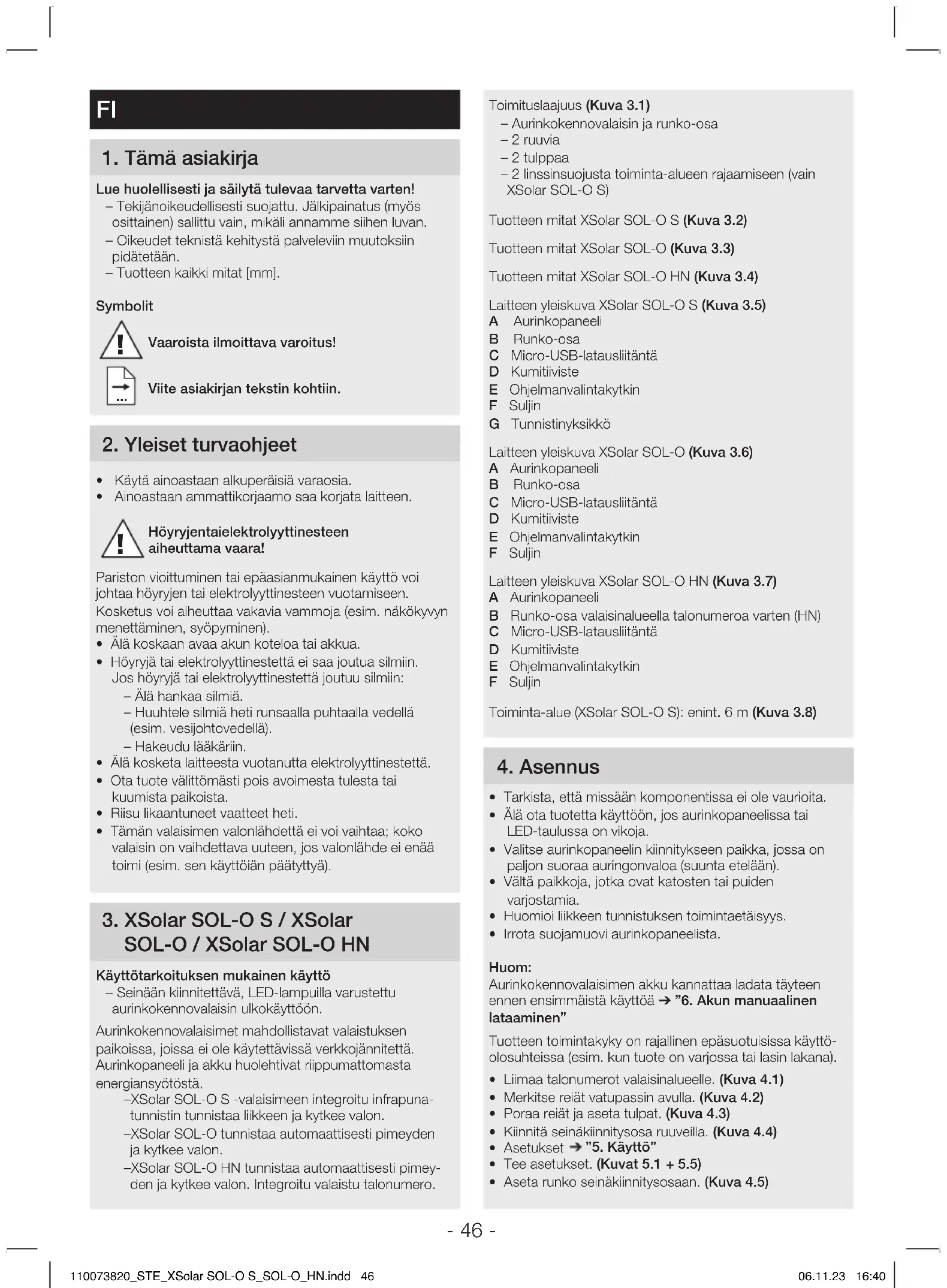110073820_STE_XSolar SOL-O S_SOL-O_HN.indd 46110073820_STE_XSolar SOL-O S_SOL-O_HN.indd 46 06.11.23 16:4006.11.23 16:40- 47 - 5 Käyttö Ennen ensimmäistä käyttöä