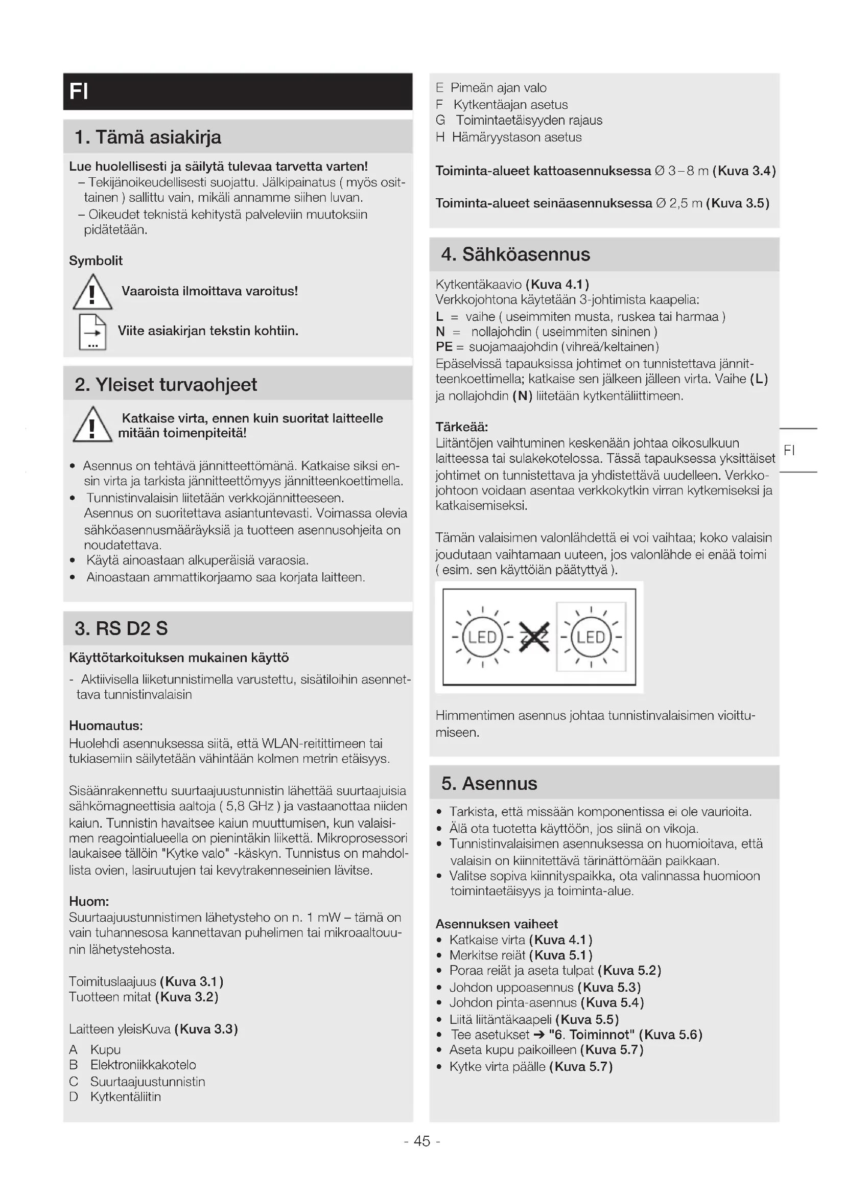 - Asennus on tehtävä jännitteettömänä. Katkaise siksi en-sin virta ja tarkista jännitteettömyys jännitteenkoettimella. • Tunnistinvalaisin liitetään verkkojännitteeseen. Asennus on suoritettava asiantuntevasti. Voimassa olevia sähköasennusmääräyksiä ja tuotteen asennusohjeita on noudatettava.• Käytä ainoastaan alkuperäisiä varaosia.• Ainoastaan ammattikorjaamo saa korjata laitteen. 3 RS D2 S Käyttötarkoituksen mukainen käyttö- Aktiivisella liiketunnistimella varustettu, sisätiloihin asennet-tava tunnistinvalaisinHuomautus:Huolehdi asennuksessa siitä, että WLAN-reitittimeen tai tukiasemiin säilytetään vähintään kolmen metrin etäisyys.Sisäänrakennettu suurtaajuustunnistin lähettää suurtaajuisia sähkömagneettisia aaltoja ( 5,8 GHz ) ja vastaanottaa niiden kaiun. Tunnistin havaitsee kaiun muuttumisen, kun valaisi-men reagointialueella on pienintäkin liikettä. Mikroprosessori laukaisee tällöin "Kytke valo" -käskyn. Tunnistus on mahdol-lista ovien, lasiruutujen tai kevytrakenneseinien lävitse. Huom: Suurtaajuustunnistimen lähetysteho on n. 1 mW – tämä on vain tuhannesosa kannettavan puhelimen tai mikroaaltouu-nin lähetystehosta.Toimituslaajuus ( Kuva31 )Tuotteen mitat ( Kuva32 )Laitteen yleisKuva ( Kuva33 )A KupuB ElektroniikkakoteloC SuurtaajuustunnistinD Kytkentäliitin