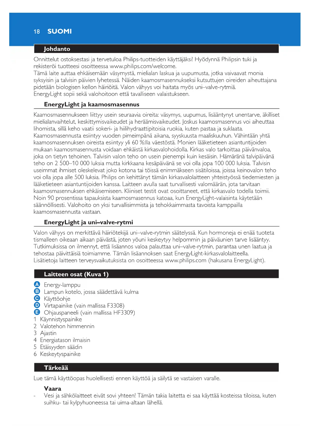 DEUTSCH 1718 Johdanto Onnittelut ostoksestasi ja tervetuloa Philips-tuotteiden käyttäjäksi! Hyödynnä Philipsin tuki ja rekisteröi tuotteesi osoitteessa www.philips.com/welcome. Tämä laite auttaa ehkäisemään väsymystä, mielialan laskua ja uupumusta, jotka vaivaavat monia syksyisin ja talvisin päivien lyhetessä. Näiden kaamosmasennukseksi kutsuttujen oireiden aiheuttajana pidetään biologisen kellon häiriöitä. Valon vähyys voi haitata myös uni–valve-rytmiä. EnergyLight sopii sekä valohoitoon että tavalliseen valaistukseen. EnergyLight ja kaamosmasennus Kaamosmasennukseen liittyy usein seuraavia oireita: väsymys, uupumus, lisääntynyt unentarve, äkilliset mielialanvaihtelut, keskittymisvaikeudet ja heräämisvaikeudet. Joskus kaamosmasennus voi aiheuttaa lihomista, sillä keho vaatii sokeri- ja hiilihydraattipitoisia ruokia, kuten pastaa ja suklaata. Kaamosmasennusta esiintyy vuoden pimeimpänä aikana, syyskuusta maaliskuuhun. Vähintään yhtä kaamosmasennuksen oireista esiintyy yli 60 %:lla väestöstä. Monien lääketieteen asiantuntijoiden mukaan kaamosmasennusta voidaan ehkäistä kirkasvalohoidolla. Kirkas valo tarkoittaa päivänvaloa, joka on tietyn tehoinen. Talvisin valon teho on usein pienempi kuin kesäisin. Hämäränä talvipäivänä teho on 2 500–10 000 luksia mutta kirkkaana kesäpäivänä se voi olla jopa 100 000 luksia. Talvisin useimmat ihmiset oleskelevat joko kotona tai töissä enimmäkseen sisätiloissa, joissa keinovalon teho voi olla jopa alle 500 luksia. Philips on kehittänyt tämän kirkasvalolaitteen yhteistyössä tiedemiesten ja lääketieteen asiantuntijoiden kanssa. Laitteen avulla saat turvallisesti valomäärän, jota tarvitaan kaamosmasennuksen ehkäisemiseen. Kliiniset testit ovat osoittaneet, että kirkasvalo todella toimii. Noin 90 prosentissa tapauksista kaamosmasennus katoaa, kun EnergyLight-valaisinta käytetään säännöllisesti. Valohoito on yksi turvallisimmista ja tehokkaimmasta tavoista kamppailla kaamosmasennusta vastaan. EnergyLight ja uni–valve-rytmi Valon vähyys on merkittävä häiriötekijä uni–valve-rytmin säätelyssä. Kun hormoneja ei enää tuoteta tismalleen oikeaan aikaan päivästä, joten yöuni keskeytyy helpommin ja päiväunien tarve lisääntyy. Tutkimuksissa on ilmennyt, että lisäannos valoa palauttaa uni–valve-rytmin, parantaa unen laatua ja tehostaa päivittäisiä toimiamme. Tämän lisäannoksen saat EnergyLight-kirkasvalolaitteella. Lisätietoja laitteen terveysvaikutuksista on osoitteessa www.philips.com (hakusana EnergyLight). Laitteen osat (Kuva 1) A Energy-lamppu B Lampun kotelo, jossa säädettävä kulma C Käyttöohje D Virtapainike (vain mallissa F3308) E Ohjauspaneeli (vain mallissa HF3309) 1 Käynnistyspainike 2 Valotehon himmennin 3 Ajastin 4 Energiatason ilmaisin 5 Etäisyyden säädin 6 Keskeytyspainike Tärkeää Lue tämä käyttöopas huolellisesti ennen käyttöä ja säilytä se vastaisen varalle. Vaara Vesi ja sähkölaitteet eivät sovi yhteen! Tämän takia laitetta ei saa käyttää kosteissa tiloissa, kuten suihku- tai kylpyhuoneessa tai uima-altaan lähellä.