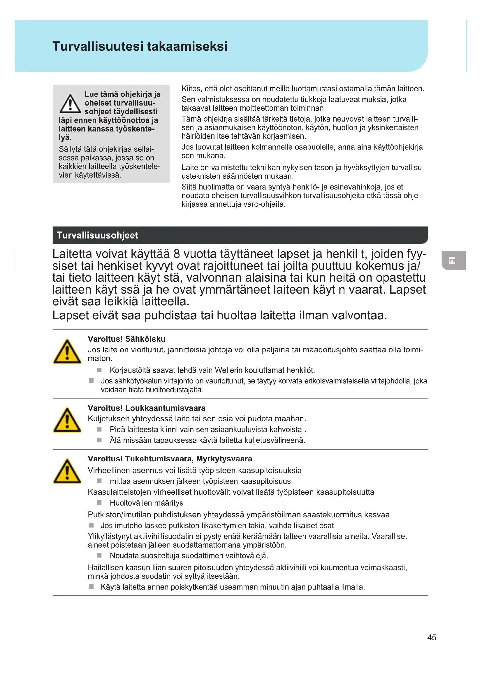 Kiitos,ettäoletosoittanutmeilleluottamustasiostamallatämänlaitteen. Senvalmistuksessaonnoudatettutiukkojalaatuvaatimuksia,jotka takaavat laitteen moitteettoman toiminnan. Tämäohjekirjasisältäätärkeitätietoja,jotkaneuvovatlaitteenturvalli- senjaasianmukaisenkäyttöönoton,käytön,huollonjayksinkertaisten häiriöiden itse tehtävän korjaamisen. Josluovutatlaitteenkolmannelleosapuolelle,annaainakäyttöohjekirja sen mukana. Laiteonvalmistettutekniikannykyisentasonjahyväksyttyjenturvallisu- usteknisten säännösten mukaan. Siitähuolimattaonvaarasyntyähenkilö-jaesinevahinkoja,joset noudata oheisen turvallisuusvihkon turvallisuusohjeita etkä tässä ohje- kirjassa annettuja varo-ohjeita. Turvallisuutesi takaamiseksi Lue tämä ohjekirja ja oheiset turvallisuu- sohjeet täydellisesti läpi ennen käyttöönottoa ja laitteen kanssa työskente- lyä. Säilytätätäohjekirjaasellai- sessapaikassa,jossaseon kaikkienlaitteellatyöskentele- vienkäytettävissä. Turvallisuusohjeet Laitettavoivatkäyttää8vuottatäyttäneetlapsetjahenkilt,joidenfyy- sisettaihenkisetkyvytovatrajoittuneettaijoiltapuuttuukokemusja/ taitietolaitteenkäytstä,valvonnanalaisinataikunheitäonopastettu laitteenkäytssäjaheovatymmärtäneetlaiteenkäytnvaarat.Lapset eivät saa leikkiä laitteella. Lapset eivät saa puhdistaa tai huoltaa laitetta ilman valvontaa. Varoitus! Sähköisku Joslaiteonvioittunut,jännitteisiäjohtojavoiollapaljainataimaadoitusjohtosaattaaollatoimi- maton. Korjaustöitä saavat tehdä vain Wellerin kouluttamat henkilöt. Jossähkötyökalunvirtajohtoonvaurioitunut,setäytyykorvataerikoisvalmisteisellavirtajohdolla,joka voidaan tilata huoltoedustajalta. Varoitus! Loukkaantumisvaara Kuljetuksenyhteydessälaitetaisenosiavoipudotamaahan. Pidä laitteesta kiinni vain sen asiaankuuluvista kahvoista.. Älämissääntapauksessakäytälaitettakuljetusvälineenä. Varoitus! Tukehtumisvaara, Myrkytysvaara Virheellinenasennusvoilisätätyöpisteenkaasupitoisuuksia mittaaasennuksenjälkeentyöpisteenkaasupitoisuus Kaasulaitteistojenvirheellisethuoltovälitvoivatlisätätyöpisteenkaasupitoisuutta Huoltovälienmääritys Putkiston/imutilanpuhdistuksenyhteydessäympäristöilmansaastekuormituskasvaa Josimuteholaskeeputkistonlikakertymientakia,vaihdalikaisetosat Ylikyllästynytaktiivihiilisuodatineipystyenääkeräämääntalteenvaarallisiaaineita. Vaaralliset aineetpoistetaanjälleensuodattamattomanaympäristöön. Noudata suositeltuja suodattimen vaihtovälejä. Haitallisenkaasunliiansuurenpitoisuudenyhteydessäaktiivihiilivoikuumentuavoimakkaasti, minkäjohdostasuodatinvoisyttyäitsestään. Käytälaitettaennenpoiskytkentääuseammanminuutinajanpuhtaallailmalla.46
