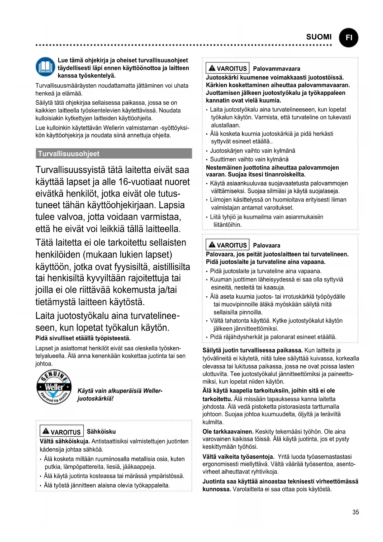 SUOMI Hiriöt ja viat tytyy korjata vlittömsti. Ennen laitteen/ työkalun jokaista käyttökertaa täytyy tarkistaa huolellisesti, että varolaitteet toimivat moitteettomasti ja määräysten mu- kaisesti. Tarkista, että liikkuvat osat toimivat moitteettomasti eivätkä jumitu. Varmista, että kaikki osat ovat ehjiä. Laitteen moitteettoman toiminnan takaamiseksi kaikkien osien täytyy olla oikein asennettuina paikoillaan ja täyttää kaikki asiaan- kuuluvat vaatimukset. Käytä oikeaa työkalua. Käytä vai sellaisia tarvikkeita tai lisälaitteita, jotka on ilmoitettu tarvikelistassa tai joiden käyt- töön valmistaja on antanut luvan. Käytä WELLER-tarvikkeita tai lisälaitteista vain alkuperäisissä WELLER-laitteissa. Muiden valmistamien työkalujen ja tarvikkeiden käyttö voi aiheuttaa loukkaantumisvaaran. Varmista työkalun turvallisuus. Käytä kiinnityslaitteita työkappaleen paikallaan pitämiseen. Kyt juotossavun poistoimuria. Kun käytettävissä on juotossavun imurin liitäntään tarvittavat varusteet, varmista, että ne on kytketty paikoilleen ja että niitä käytetään oikein. Tarkoituksenmukainen Käyttö Käytä juotoskolvia yksinomaan käyttöohjekirjassa neuvotulla tavalla juottamiseen ja juotosten irrottamiseen tässä ilmoite- tuilla edellytyksillä. Juotoskolvia saa käyttää vain Weller -syöttöyksiköiden kanssa. Tätä laitetta saa käyttää vain huonelämpötilassa ja sisätilois- sa. Suojaa kosteudelta ja suoralta auringonpaisteelta. Kyttjryhmt Suuremman onnettomuusvaaran takia joitakin työvaiheita saavat tehdä vain koulutetut ammattihenkilöt. Työvaihe Kyttjryhmt Juotosparametrien esia- setus Teknisen koulutuksen omaa- va ammattihenkilöstö Sähköisten varaosien vaihto Sähköasentajat Huoltovälien esiasetus Turvallisuusammattilaiset Laitteen käyttö Suodattimen vaihto Työntekijät Laitteen käyttö Suodattimen vaihto Sähköisten varaosien vaihto Teknisen alan oppisopimus- koulutettavat koulutetun ammattilaisen valvonnassa aseman hoito ja huolto VAROITUS Ennen korjaus- ja huoltotöiden aloittamista on pistotulppa irrotettava pistorasiasta. Anna laitteen jhty. Tarkista kaikki kytketyt johdot ja letkut säännöllisin väliajoin. Poista vialliset sähkötyökalut välittömästi käytöstä. Tukkeutuneita suuttimia ei saa käyttää. Korjaustöit saavat tehd vain Wellerin kouluttamat henkilöt. Käyttäkää ainoastaan alkuperäisiä varaosia. VAROITUS Palovammavaara