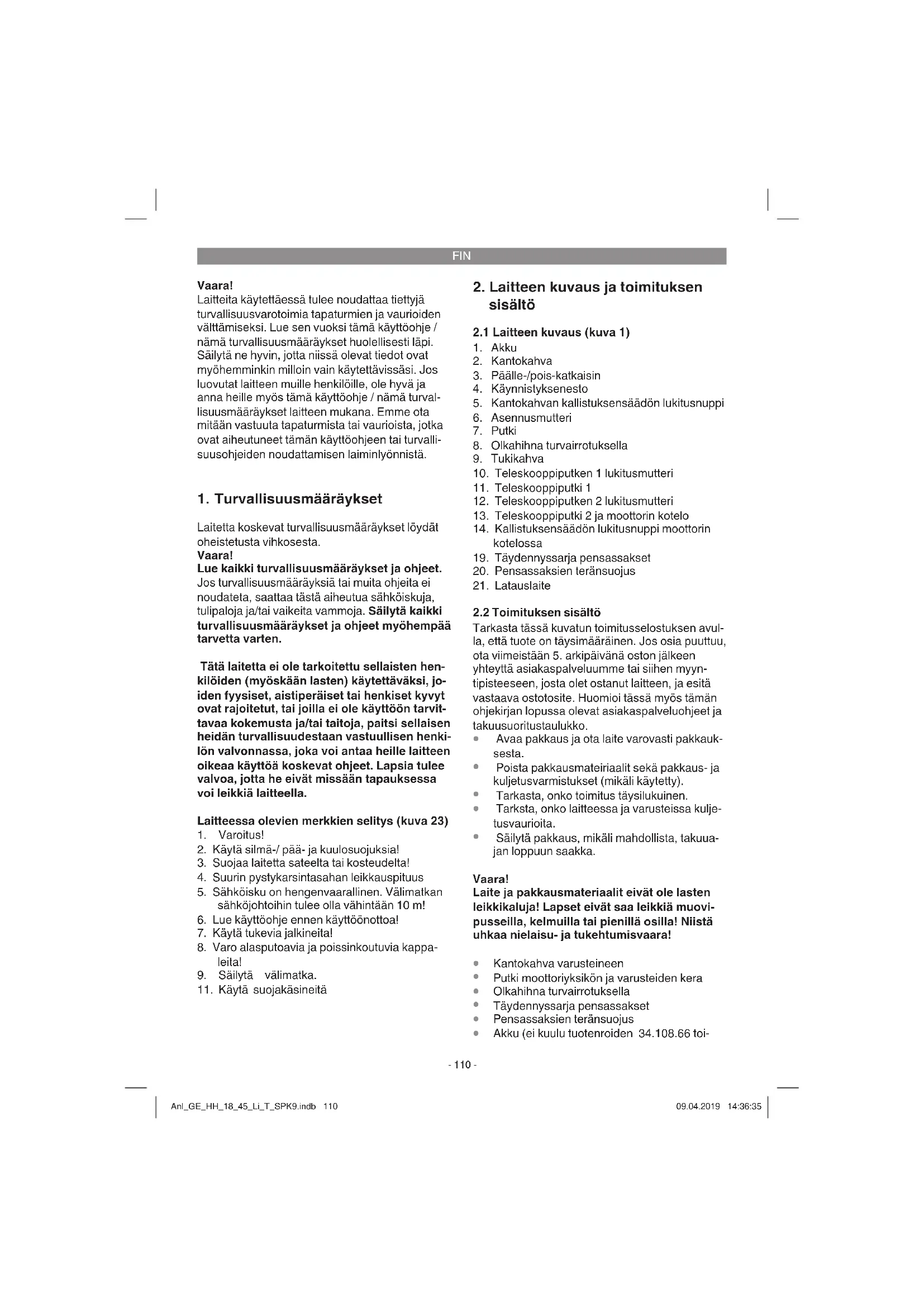 Varo! Asenna akku vasta sen jälkeen kun laite on koottu täysin ja kaikki säädöt on suoritettu. Käytä aina suojakäsineitä käsitellessäsi laitetta, jotta vältät loukkaantumisen. Ota kaikki osat huolelli- sesti pakkauksesta ja tarkasta, että ne ovat täysi- lukuiset (kuva 1). Anl_GE_HH_18_45_Li_T_SPK9.indb 111Anl_GE_HH_18_45_Li_T_SPK9.indb 111 09.04.2019 14:36:3509.04.2019 14:36:35FIN