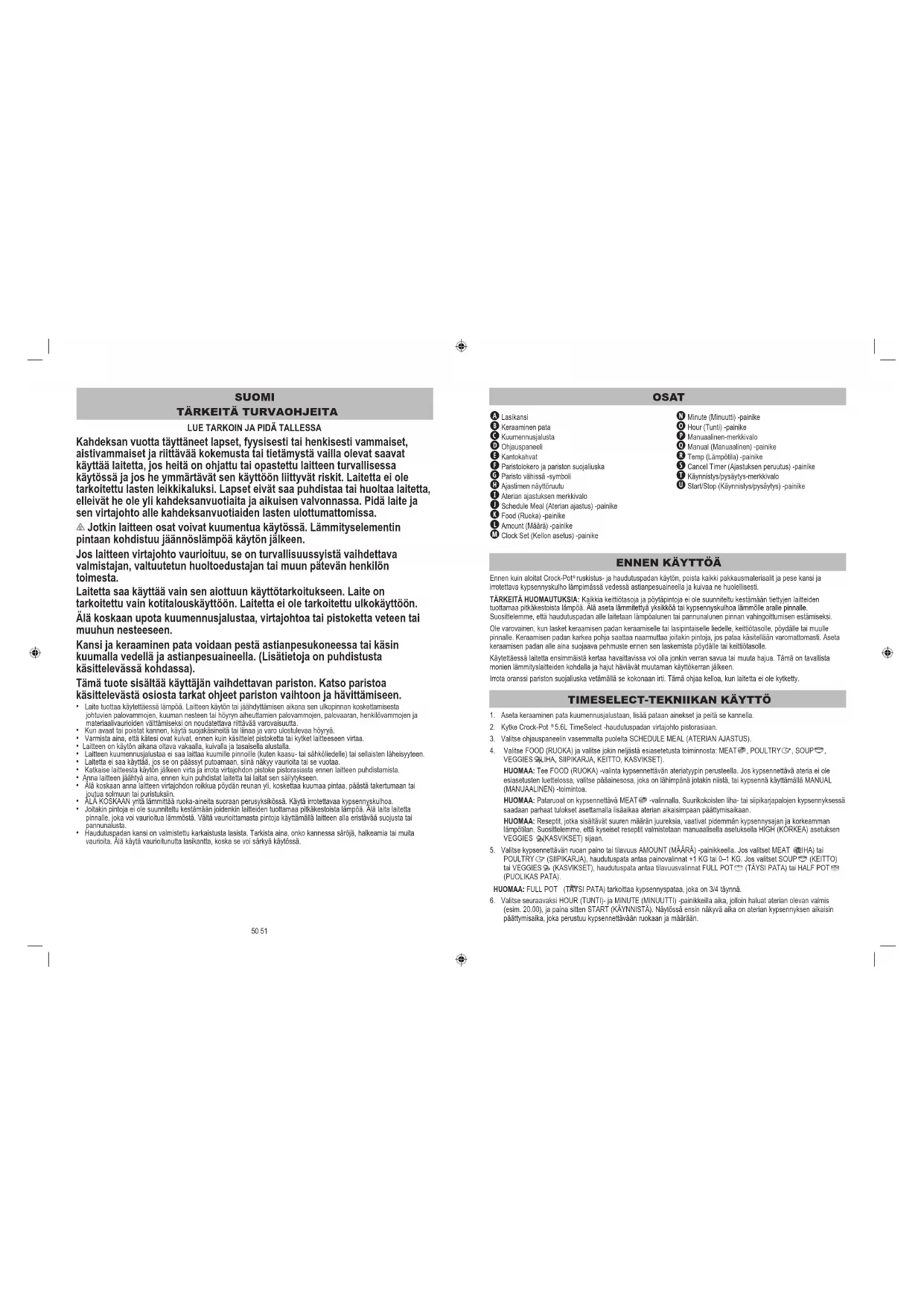 (esim. 20.00), ja paina sitten START (KÄYNNISTÄ). Näytössä ensin näkyvä aika on aterian kypsennyksen aikaisin päättymisaika, joka perustuu kypsennettävään ruokaan ja määrään. A Lasikansi B Keraaminen pata C Kuumennusjalusta D Ohjauspaneeli E Kantokahvat F Paristolokero ja pariston suojaliuska G Paristo vähissä -symboli H Ajastimen näyttöruutu I Aterian ajastuksen merkkivalo J Schedule Meal (Aterian ajastus) -painike K Food (Ruoka) -painike L Amount (Määrä) -painike M Clock Set (Kellon asetus) -painike N Minute (Minuutti) -painike O Hour (Tunti) -painike P Manuaalinen-merkkivalo Q Manual (Manuaalinen) -painike R Temp (Lämpötila) -painike S Cancel Timer (Ajastuksen peruutus) -painike T Käynnistys/pysäytys-merkkivalo U Start/Stop (Käynnistys/pysäytys) -painike52 53 HUOMAA: SCHEDULE MEAL (ATERIAN AJASTUS) -toiminto ei kypsennä ruokaa pidempään kuin 12 tuntia kypsennyksen alkamisajasta. Kun ajastetun aterian kellonaika on ylittynyt, haudutuspata siirtyy automaattisesti KEEP WARM (LÄMPIMÄNÄPITO) -asetukselle. HUOMAA: TimeSelect-tekniikka määrittää automaattisesti oikean lämpöasetuksen edellä mainittujen asetusten perusteella. Ruoka pidetään aina elintarviketurvallisessa lämpötilassa, paitsi sähkökatkoksen sattuessa. Katso lisätietoja sähkökatkoksiin liittyen sivulta 9.