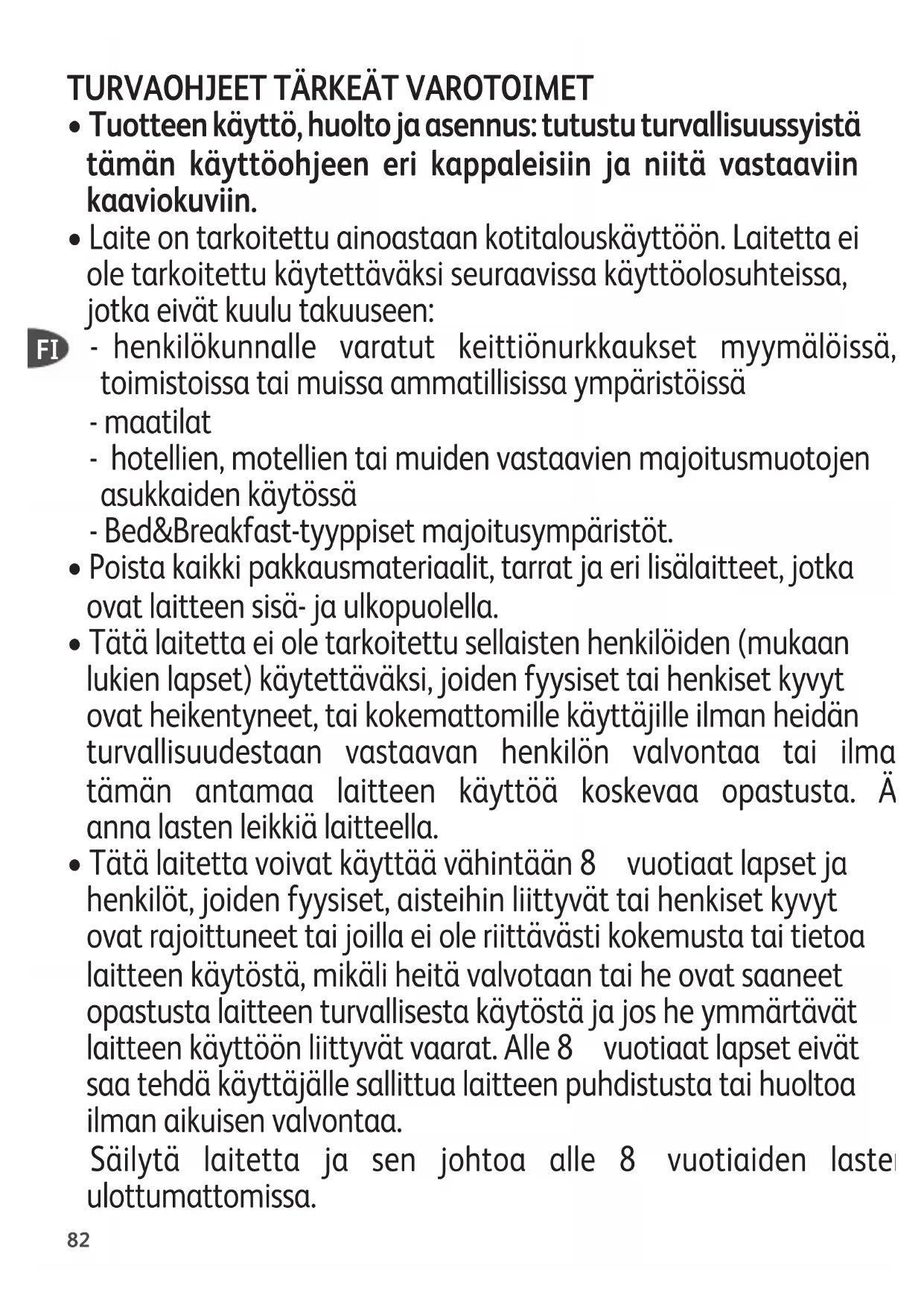 - Tätälaitettavoivatkäyttäävähintään8‐vuotiaatlapsetja henkilöt,joidenfyysiset,aisteihinliittyvättaihenkisetkyvyt ovatrajoittuneettaijoillaeioleriittävästikokemustataitietoa laitteenkäytöstä,mikäliheitävalvotaantaiheovatsaaneet opastustalaitteenturvallisestakäytöstäjajosheymmärtävät laitteenkäyttöönliittyvätvaarat.Alle8‐vuotiaatlapseteivät saatehdäkäyttäjällesallittualaitteenpuhdistustataihuoltoa ilmanaikuisenvalvontaa. Säilytä laitetta ja sen johtoa alle 8‐vuotiaiden lasten ulottumattomissa.83
