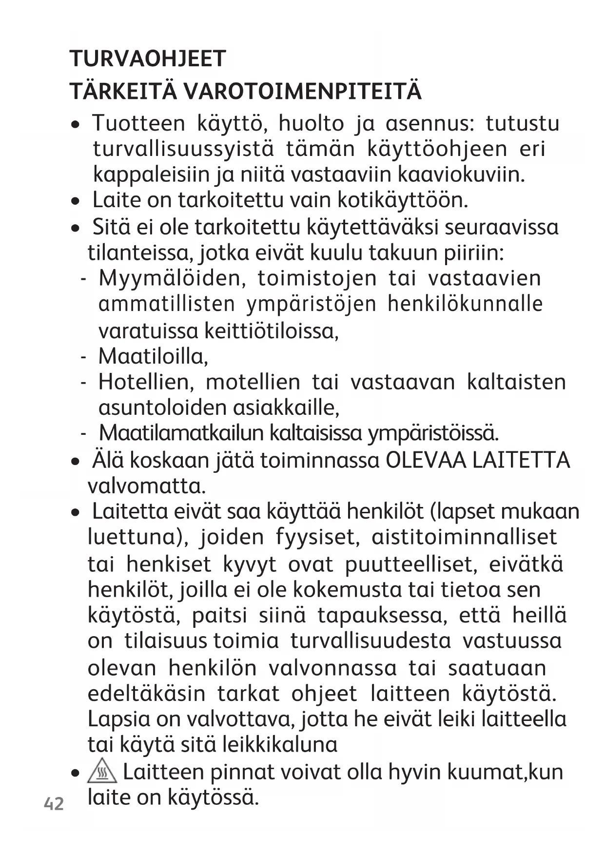 - Laitetta eivät saa käyttää henkilöt (lapset mukaan luettuna), joiden fyysiset, aistitoiminnalliset tai henkiset kyvyt ovat puutteelliset, eivätkä henkilöt, joilla ei ole kokemusta tai tietoa sen käytöstä, paitsi siinä tapauksessa, että heillä on tilaisuus toimia turvallisuudesta vastuussa olevan henkilön valvonnassa tai saatuaan edeltäkäsin tarkat ohjeet laitteen käytöstä. Lapsia on valvottava, jotta he eivät leiki laitteella tai käytä sitä leikkikaluna