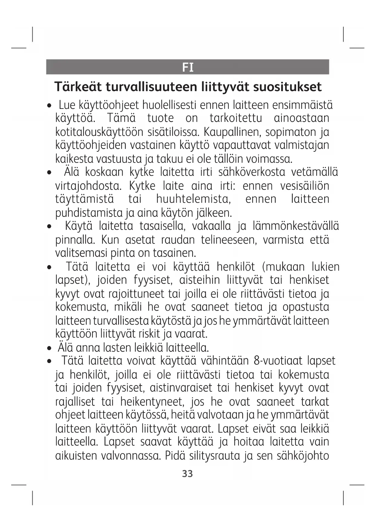 - Tätä laitetta voivat käyttää vähintään 8-vuotiaat lapset ja henkilöt, joilla ei ole riittävästi tietoa tai kokemusta tai joiden fyysiset, aistinvaraiset tai henkiset kyvyt ovat rajalliset tai heikentyneet, jos he ovat saaneet tarkat ohjeet laitteen käytössä, heitä valvotaan ja he ymmärtävät laitteen käyttöön liittyvät vaarat. Lapset eivät saa leikkiä laitteella. Lapset saavat käyttää ja hoitaa laitetta vain aikuisten valvonnassa. Pidä silitysrauta ja sen sähköjohto 33aina poissa alle 8-vuotiaiden lasten ulottuvilta, kun raudassa on virtaa tai rauta on jäähtymässä.