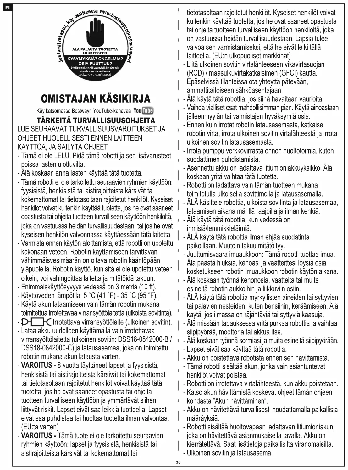 - Tämä ei ole LELU. Pidä tämä robotti ja sen lisävarusteet poissa lasten ulottuvilta. - Älä koskaan anna lasten käyttää tätä tuotetta. - Tämä robotti ei ole tarkoitettu seuraavien ryhmien käyttöön: fyysisistä, henkisistä tai aistirajoitteista kärsivät tai kokemattomat tai tietotasoltaan rajoitetut henkilöt. Kyseiset henkilöt voivat kuitenkin käyttää tuotetta, jos he ovat saaneet opastusta tai ohjeita tuotteen turvalliseen käyttöön henkilöltä, joka on vastuussa heidän turvallisuudestaan, tai jos he ovat kyseisen henkilön valvonnassa käyttäessään tätä laitetta. - Varmista ennen käytön aloittamista, että robotti on upotettu kokonaan veteen. Robotin käyttämiseen tarvittavan vähimmäisvesimäärän on oltava robotin kääntöpään yläpuolella. Robotin käyttö, kun sitä ei ole upotettu veteen oikein, voi vahingoittaa laitetta ja mitätöidä takuun. - Enimmäiskäyttösyvyys vedessä on 3 metriä (10 ft). - Käyttöveden lämpötila: 5 °C (41 °F) - 35 °C (95 °F). - Käytä akun lataamiseen vain tämän robotin mukana toimitettua irrotettavaa virransyöttölaitetta (ulkoista sovitinta). - Irrotettava virransyöttölaite (ulkoinen sovitin). - Lataa akku uudelleen käyttämällä vain irrotettavaa virransyöttölaitetta (ulkoinen sovitin: DSS18-0842000-B / DSS18-0842000-C) ja latausasemaa, joka on toimitettu robotin mukana akun latausta varten. - VAROITUS - 8 vuotta täyttäneet lapset ja fyysisistä, henkisistä tai aistirajoitteista kärsivät tai kokemattomat tai tietotasoltaan rajoitetut henkilöt voivat käyttää tätä tuotetta, jos he ovat saaneet opastusta tai ohjeita tuotteen turvalliseen käyttöön ja ymmärtävät siihen liittyvät riskit. Lapset eivät saa leikkiä tuotteella. Lapset eivät saa puhdistaa tai huoltaa tuotetta ilman valvontaa. (EU:ta varten) - VAROITUS - Tämä tuote ei ole tarkoitettu seuraavien ryhmien käyttöön: lapset ja fyysisistä, henkisistä tai aistirajoitteista kärsivät tai kokemattomat tai tietotasoltaan rajoitetut henkilöt. Kyseiset henkilöt voivat kuitenkin käyttää tuotetta, jos he ovat saaneet opastusta tai ohjeita tuotteen turvalliseen käyttöön henkilöltä, joka on vastuussa heidän turvallisuudestaan. Lapsia tulee valvoa sen varmistamiseksi, että he eivät leiki tällä laitteella. (EU:n ulkopuoliset markkinat) - Liitä ulkoinen sovitin virtalähteeseen vikavirtasuojan (RCD) / maasulkuvirtakatkaisimen (GFCI) kautta. Epäselvissä tilanteissa ota yhteyttä pätevään, ammattitaitoiseen sähköasentajaan. - Älä käytä tätä robottia, jos siinä havaitaan vaurioita. - Vaihda vialliset osat mahdollisimman pian. Käytä ainoastaan jälleenmyyjän tai valmistajan hyväksymiä osia. - Ennen kuin irrotat robotin latausasemasta, katkaise robotin virta, irrota ulkoinen sovitin virtalähteestä ja irrota ulkoinen sovitin latausasemasta. - Irrota pumppu verkkovirrasta ennen huoltotoimia, kuten suodattimen puhdistamista. - Asennettu akku on ladattava litiumioniakkuyksikkö. Älä koskaan yritä vaihtaa tätä tuotetta. - Robotti on ladattava vain tämän tuotteen mukana toimitetulla ulkoisella sovittimella ja latausasemalla. - ÄLÄ käsittele robottia, ulkoista sovitinta ja latausasemaa, lataamisen aikana märillä raajoilla ja ilman kenkiä. - Älä käytä tätä robottia, kun vedessä on ihmisiä/lemmikkieläimiä. - ÄLÄ käytä tätä robottia ilman ehjää suodatinta paikoillaan. Muutoin takuu mitätöityy. - Juuttumisvaara imuaukkoon: Tämä robotti tuottaa imua. Älä päästä hiuksia, kehoasi ja vaatteittesi löysiä osia kosketukseen robotin imuaukkoon robotin käytön aikana. - Älä koskaan työnnä kehonosia, vaatteita tai muita esineitä robotin aukkoihin ja liikkuviin osiin. - ÄLÄ käytä tätä robottia myrkyllisten aineiden tai syttyvien tai palavien nesteiden, kuten bensiinin, keräämiseen. Älä käytä, jos ilmassa on räjähtäviä tai syttyviä kaasuja. - Älä missään tapauksessa yritä purkaa robottia ja vaihtaa siipipyörää, moottoria tai akkua itse. - Älä koskaan työnnä sormiasi ja muita esineitä siipipyörään. - Lapset eivät saa käyttää tätä robottia. - Akku on poistettava robotista ennen sen hävittämistä. - Tämä robotti sisältää akun, jonka vain asiantuntevat henkilöt voivat poistaa. - Robotti on irrotettava virtalähteestä, kun akku poistetaan. - Katso akun hävittämistä koskevat ohjeet tämän ohjeen kohdasta ”Akun hävittäminen”. - Akku on hävitettävä turvallisesti noudattamalla paikallisia määräyksiä. - Robotti sisältää huoltovapaan ladattavan litiumioniakun, joka on hävitettävä asianmukaisella tavalla. Akku on kierrätettävä. Saat lisätietoja paikallisilta viranomaisilta. - Ulkoinen sovitin ja latausasema: