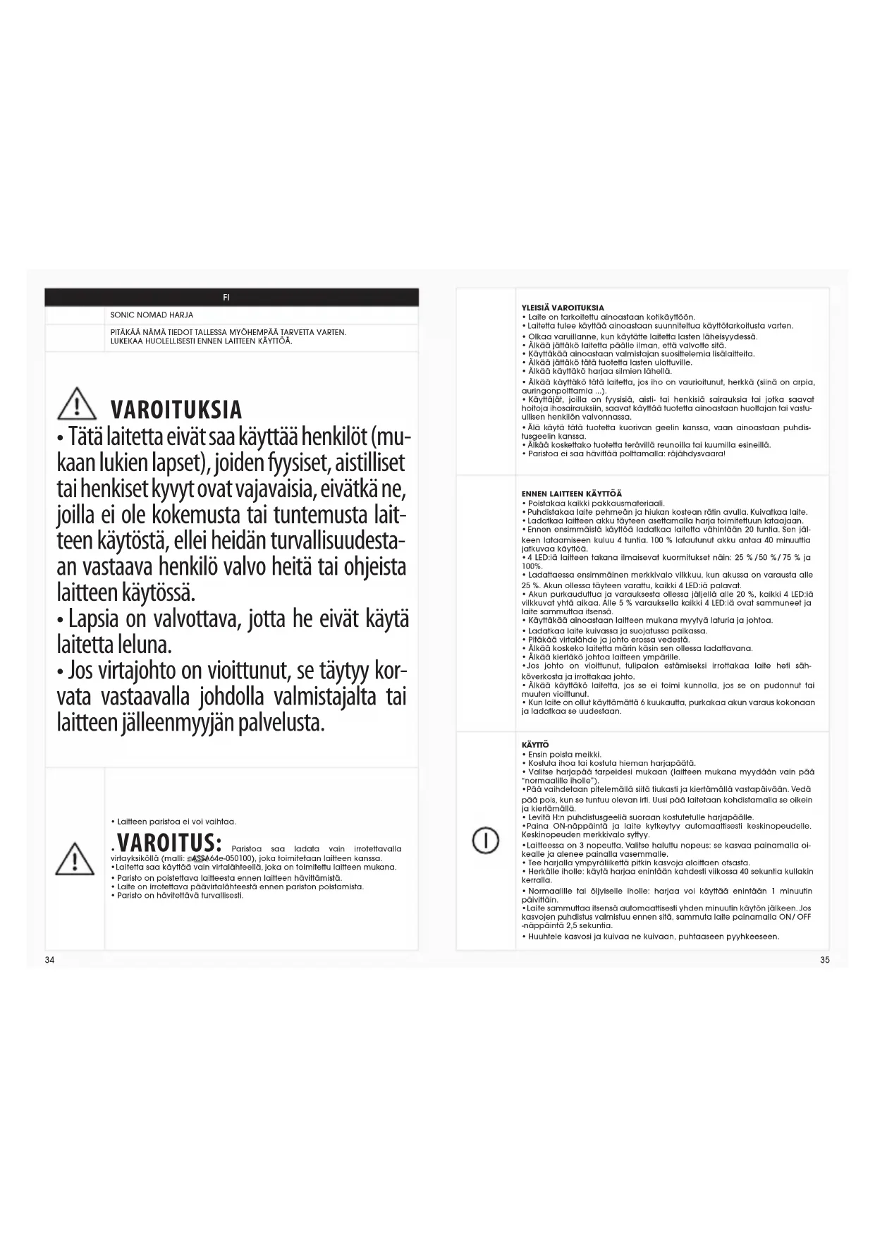 - Tätä laitetta eivät saa käyttää henkilöt (mu- kaan lukien lapset), joiden fyysiset, aistilliset tai henkiset kyvyt ovat vajavaisia, eivätkä ne, joilla ei ole kokemusta tai tuntemusta lait- teen käytöstä, ellei heidän turvallisuudesta- an vastaava henkilö valvo heitä tai ohjeista laitteen käytössä.