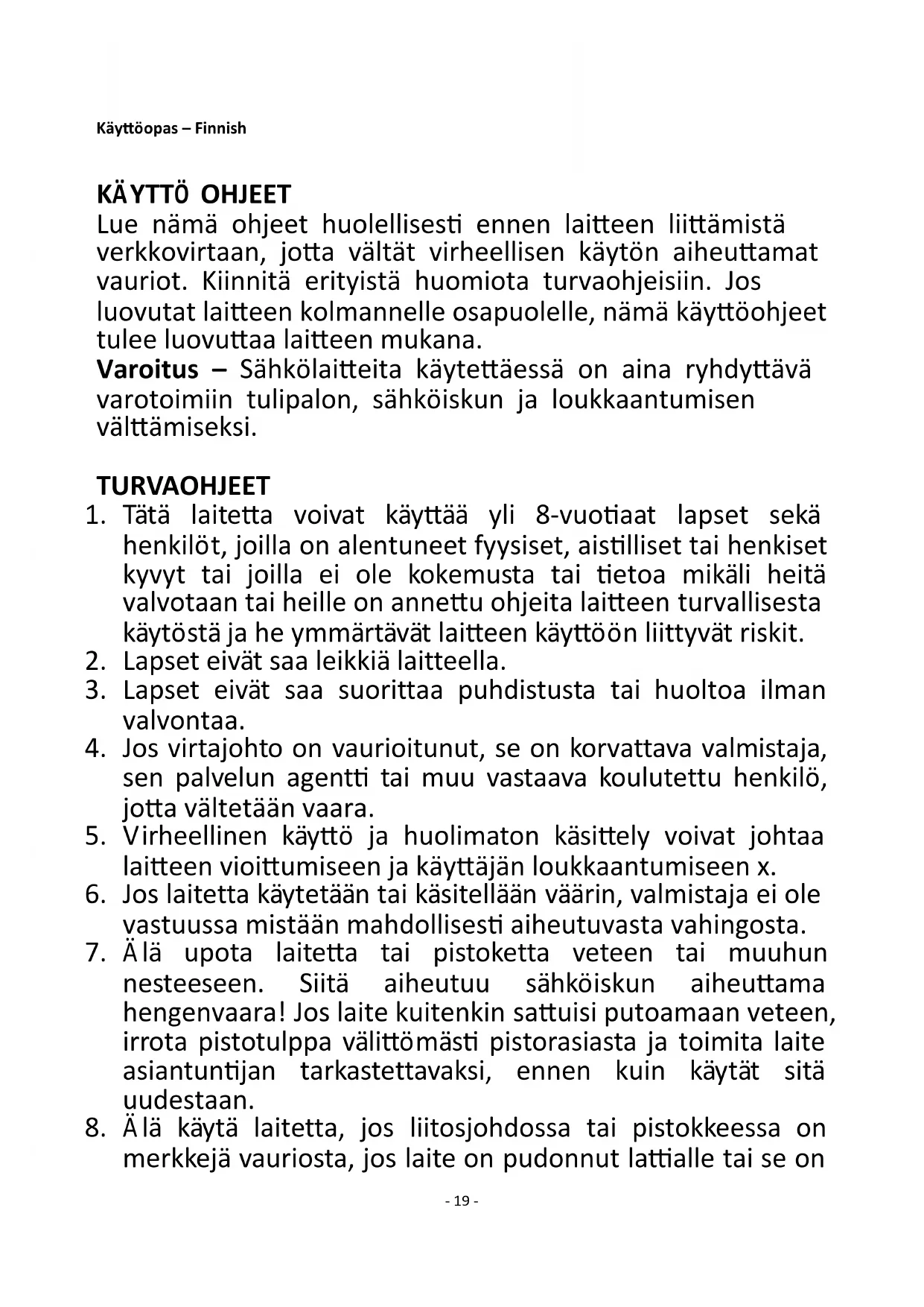 Lue nämä ohjeet huolellisesti ennen laitteen liittämistä verkkovirtaan, jotta vältät virheellisen käytön aiheuttamat vauriot. Kiinnitä erityistä huomiota turvaohjeisiin. Jos luovutat laitteen kolmannelle osapuolelle, nämä käyttöohjeet tulee luovuttaa laitteen mukana. Varoitus – Sähkölaitteita käytettäessä on aina ryhdyttävä varotoimiin tulipalon, sähköiskun ja loukkaantumisen välttämiseksi. TURVAOHJEET