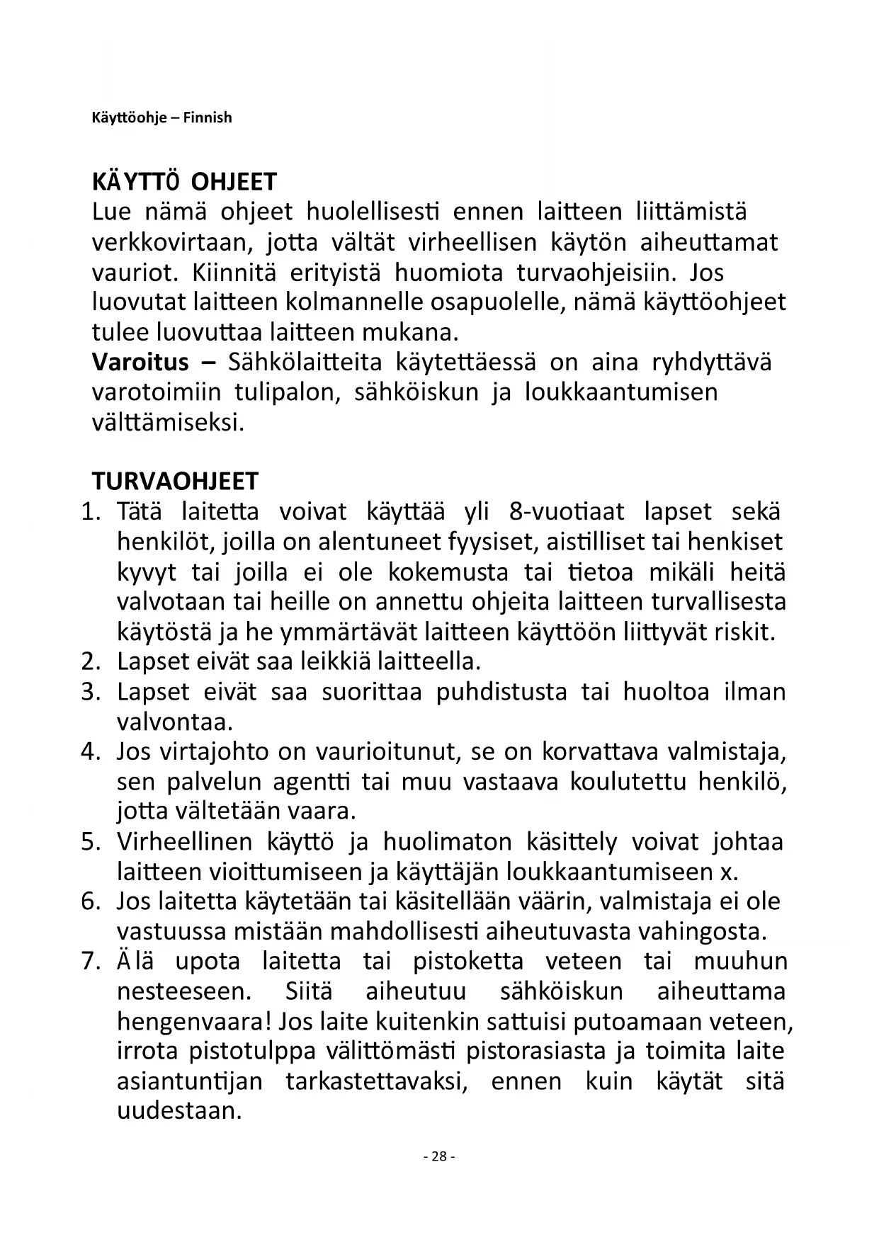 Lue nämä ohjeet huolellisesti ennen laitteen liittämistä verkkovirtaan, jotta vältät virheellisen käytön aiheuttamat vauriot. Kiinnitä erityistä huomiota turvaohjeisiin. Jos luovutat laitteen kolmannelle osapuolelle, nämä käyttöohjeet tulee luovuttaa laitteen mukana. Varoitus – Sähkölaitteita käytettäessä on aina ryhdyttävä varotoimiin tulipalon, sähköiskun ja loukkaantumisen välttämiseksi. TURVAOHJEET