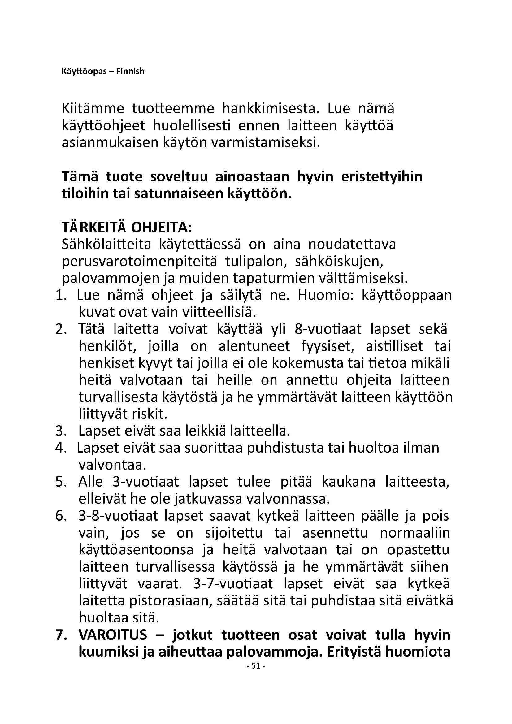 Vastab järgnevate nõukogu direktiivide nõuetele: KOMISJONI 28. aprilli 2015 aasta MÄÄRUS (EL) Nr 2015/1188 ja määrus, millega muudetakse KOMISJONI MÄÄRUST (EL) 2016/2282, millega rakendatakse Euroopa Parlamendi ja nõukogu direktiivi 2009/125/EÜ seoses kohtkütteseadmete ökodisaininõuetega. Teave tarbijale selle kohta, kuidas paigaldada, kasutada ja hooldada toodet ning teave elektroonikaseadmete jäätmete kohta, esitatakse tootega komplektis olevas kasutusjuhendis.- 51 - Käyttöopas – Finnish Kiitämme tuotteemme hankkimisesta. Lue nämä käyttöohjeet huolellisesti ennen laitteen käyttöä asianmukaisen käytön varmistamiseksi. Tämä tuote soveltuu ainoastaan hyvin eristettyihin tiloihin tai satunnaiseen käyttöön. TÄRKEITÄ OHJEITA: Sähkölaitteita käytettäessä on aina noudatettava perusvarotoimenpiteitä tulipalon, sähköiskujen, palovammojen ja muiden tapaturmien välttämiseksi.