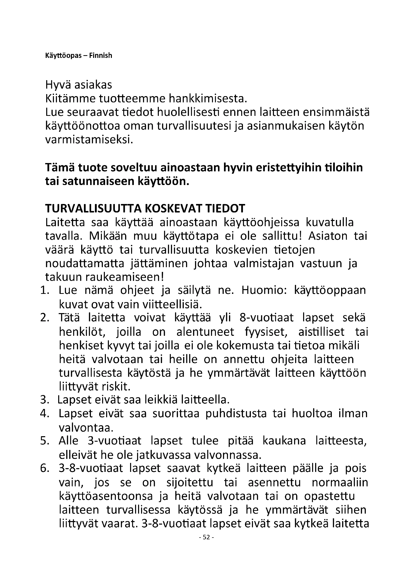Vastab järgnevate nõukogu direktiivide nõuetele: KOMISJONI 28. aprilli 2015 aasta MÄÄRUS (EL) Nr 2015/1188 ja määrus, millega muudetakse KOMISJONI MÄÄRUST (EL) 2016/2282, millega rakendatakse Euroopa Parlamendi ja nõukogu direktiivi 2009/125/EÜ seoses kohtkütteseadmete ökodisaininõuetega. Teave tarbijale selle kohta, kuidas paigaldada, kasutada ja hooldada toodet ning teave elektroonikaseadmete jäätmete kohta, esitatakse tootega komplektis olevas kasutusjuhendis.- 52 - Käyttöopas – Finnish Hyvä asiakas Kiitämme tuotteemme hankkimisesta. Lue seuraavat tiedot huolellisesti ennen laitteen ensimmäistä käyttöönottoa oman turvallisuutesi ja asianmukaisen käytön varmistamiseksi. Tämä tuote soveltuu ainoastaan hyvin eristettyihin tiloihin tai satunnaiseen käyttöön.