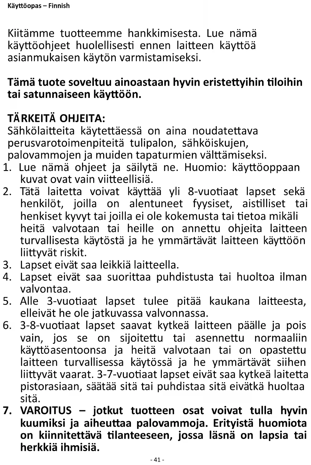 Voldoet aan de eisen van de Richtlijnen van de raad: VERORDENING (EU) Nr. 2015/1188 VAN DE COMMISSIE van 28 april 2015 en VERORDENING TOT WIJZIGING (EU) 2016/2282 VAN DE COMMISSIE ter uitvoering van Richtlijn 2009/125/EU van het Europees Parlement en de Raad betreffende de eisen inzake het ecologisch ontwerp voor toestellen voor lokale ruimteverwarming Voor informatie voor de consument over de installatie, de werking en het onderhoud van het product en de AEEA-informatie, raadpleeg de gebruiksaanwijzing die zich in de verpakking bevindt.- 41 - Käyttöopas – Finnish Kiitämme tuotteemme hankkimisesta. Lue nämä käyttöohjeet huolellisesti ennen laitteen käyttöä asianmukaisen käytön varmistamiseksi. Tämä tuote soveltuu ainoastaan hyvin eristettyihin tiloihin tai satunnaiseen käyttöön. TÄRKEITÄ OHJEITA: Sähkölaitteita käytettäessä on aina noudatettava perusvarotoimenpiteitä tulipalon, sähköiskujen, palovammojen ja muiden tapaturmien välttämiseksi.
