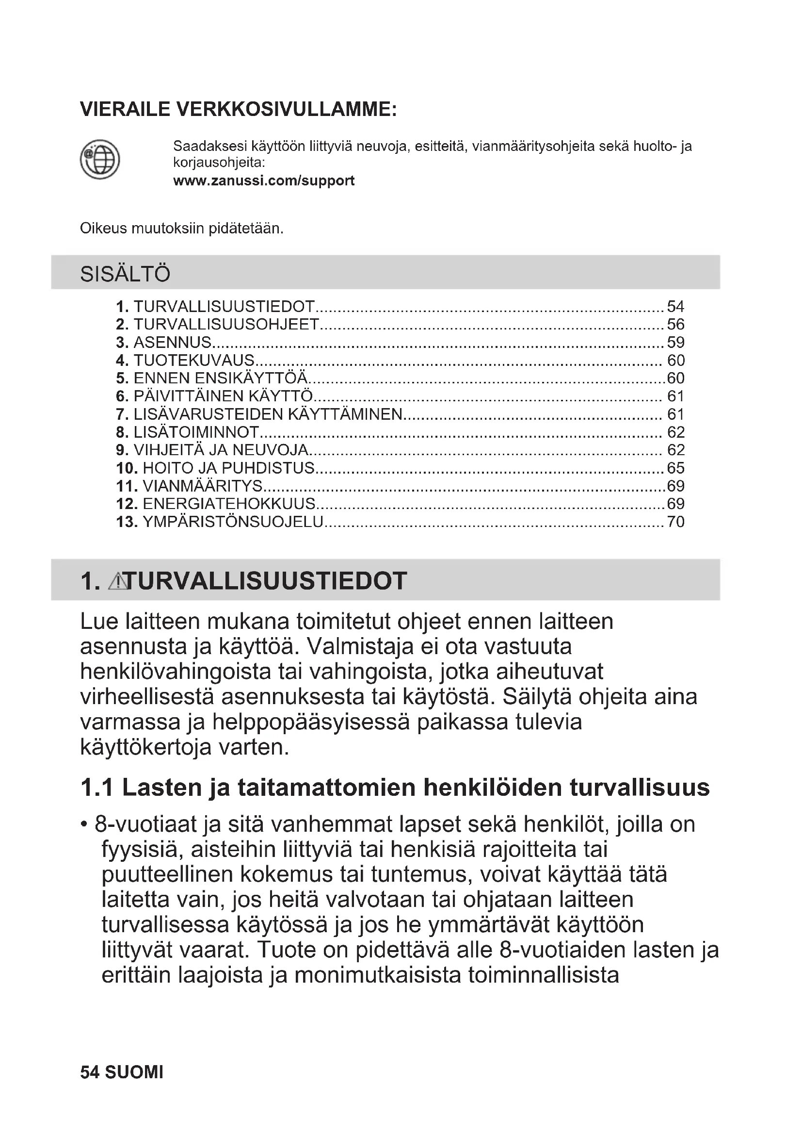 Kierrätä materiaalit, jotka on merkitty merkillä . Kierrätä pakkaus laittamalla se asianmukaiseen kierrätysastiaan. Suojele ympäristöä ja ihmisten terveyttä kierrättämällä sähkö- ja elektroniikkaromut. Älä hävitä merkillä merkittyjä kodinkoneita kotitalousjätteen mukana. Palauta tuote paikalliseen kierrätyskeskukseen tai ota yhteyttä paikalliseen viranomaiseen. 70 SUOMIVISITEZ NOTRE SITE WEB POUR : Obtenir des conseils d’utilisation, des brochures, un dépanneur, des informations surle service et les réparations :www.zanussi.com/supportSous réserve de modifications.