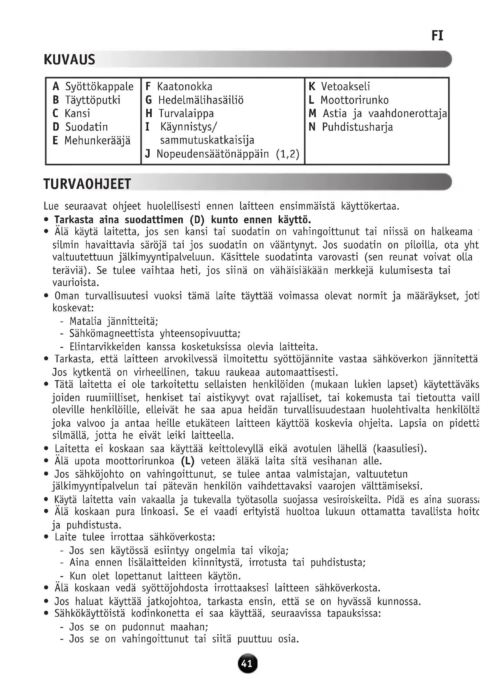 KUVAUS TURVAOHJEET A Syöttökappale B Täyttöputki C Kansi D Suodatin E Mehunkerääjä F Kaatonokka G Hedelmälihasäiliö H Turvalaippa