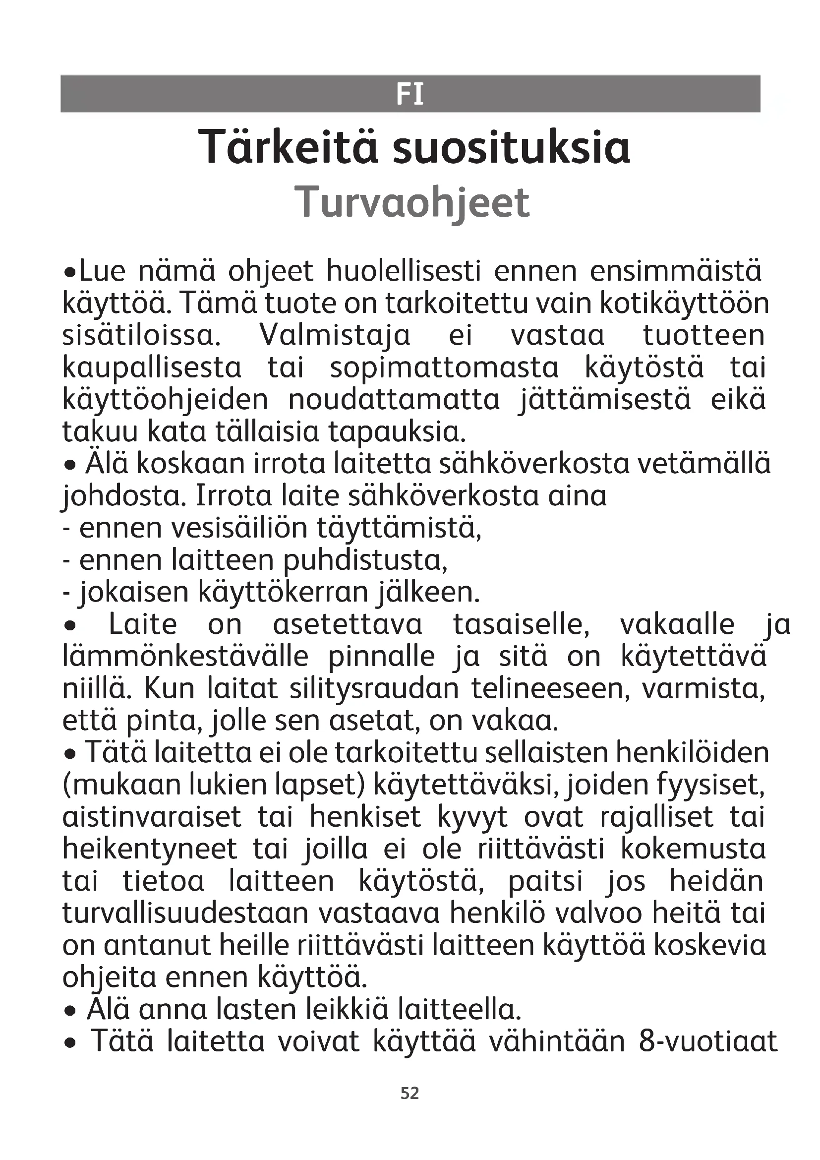 - Tätä laitetta voivat käyttää vähintään 8-vuotiaat53 lapset ja henkilöt, joilla ei ole riittävästi tietoa tai kokemusta tai joiden fyysiset, aistinvaraiset tai henkiset kyvyt ovat rajalliset tai heikentyneet, jos he ovat saaneet tarkat ohjeet laitteen käytössä, heitä valvotaan ja he ymmärtävät laitteen käyttöön liittyvät vaarat. Lapset eivät saa leikkiä laitteella. Lapset saavat tehdä käyttäjälle sallitun puhdistuksen ja huollon vain aikuisen valvonnassa. Pidä silitysrauta ja sen sähköjohto aina poissa alle 8-vuotiaiden lasten ulottuvilta, kun raudassa on virtaa tai rauta on jäähtymässä.