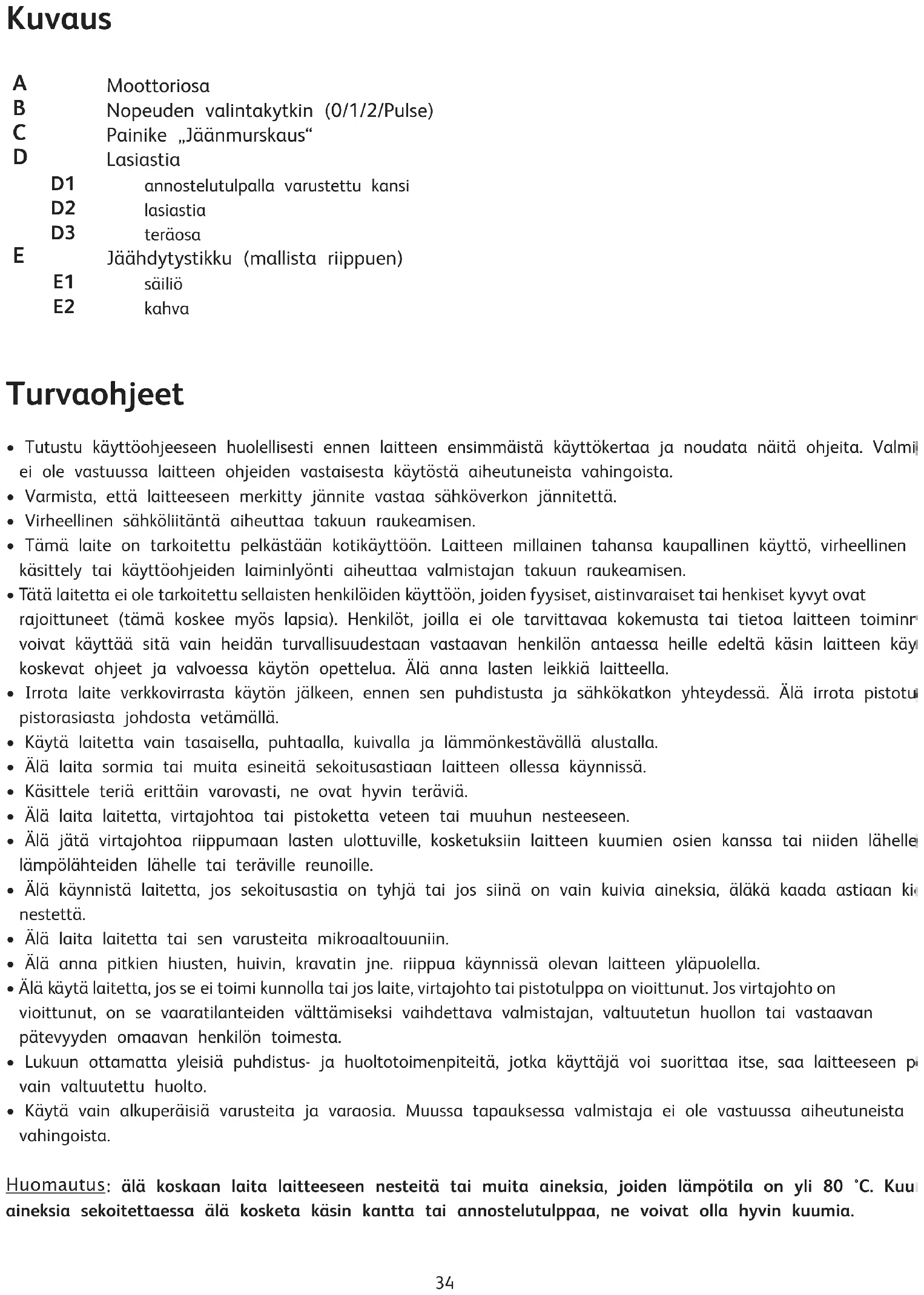 - Käytä vain alkuperäisiä varusteita ja varaosia. Muussa tapauksessa valmistaja ei ole vastuussa aiheutuneista vahingoista. Huomautus : älä koskaan laita laitteeseen nesteitä tai muita aineksia, joiden lämpötila on yli 80 °C. Kuumia aineksia sekoitettaessa älä kosketa käsin kantta tai annostelutulppaa, ne voivat olla hyvin kuumia.35 Ensimmäinen käyttökerta