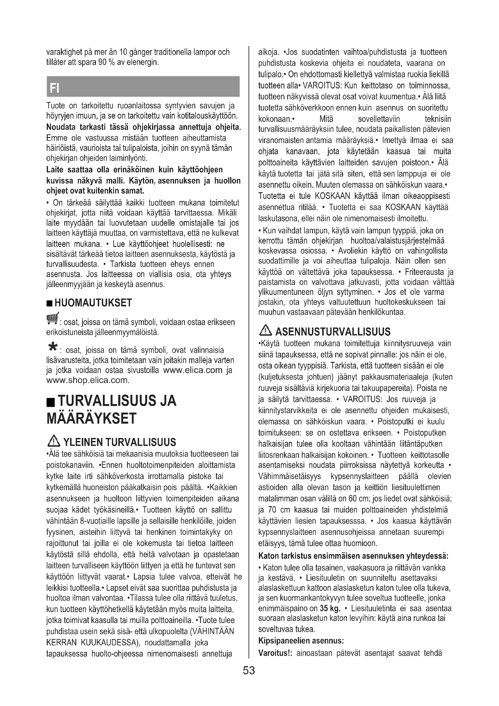 - On tärkeää säilyttää kaikki tuotteen mukana toimitetut ohjekirjat, jotta niitä voidaan käyttää tarvittaessa. Mikäli laite myydään tai luovutetaan uudelle omistajalle tai jos laitteen käyttäjä muuttaa, on varmistettava, että ne kulkevat laitteen mukana. • Lue käyttöohjeet huolellisesti: ne sisältävät tärkeää tietoa laitteen asennuksesta, käytöstä ja turvallisuudesta. • Tarkista tuotteen eheys ennen asennusta. Jos laitteessa on viallisia osia, ota yhteys jälleenmyyjään ja keskeytä asennus. HUOMAUTUKSET : osat, joissa on tämä symboli, voidaan ostaa erikseen erikoistuneista jälleenmyymälöistä. : osat, joissa on tämä symboli, ovat valinnaisia lisävarusteita, jotka toimitetaan vain joitakin malleja varten ja jotka voidaan ostaa sivustoilla www.elica.com ja www.shop.elica.com. TURVALLISUUS JA