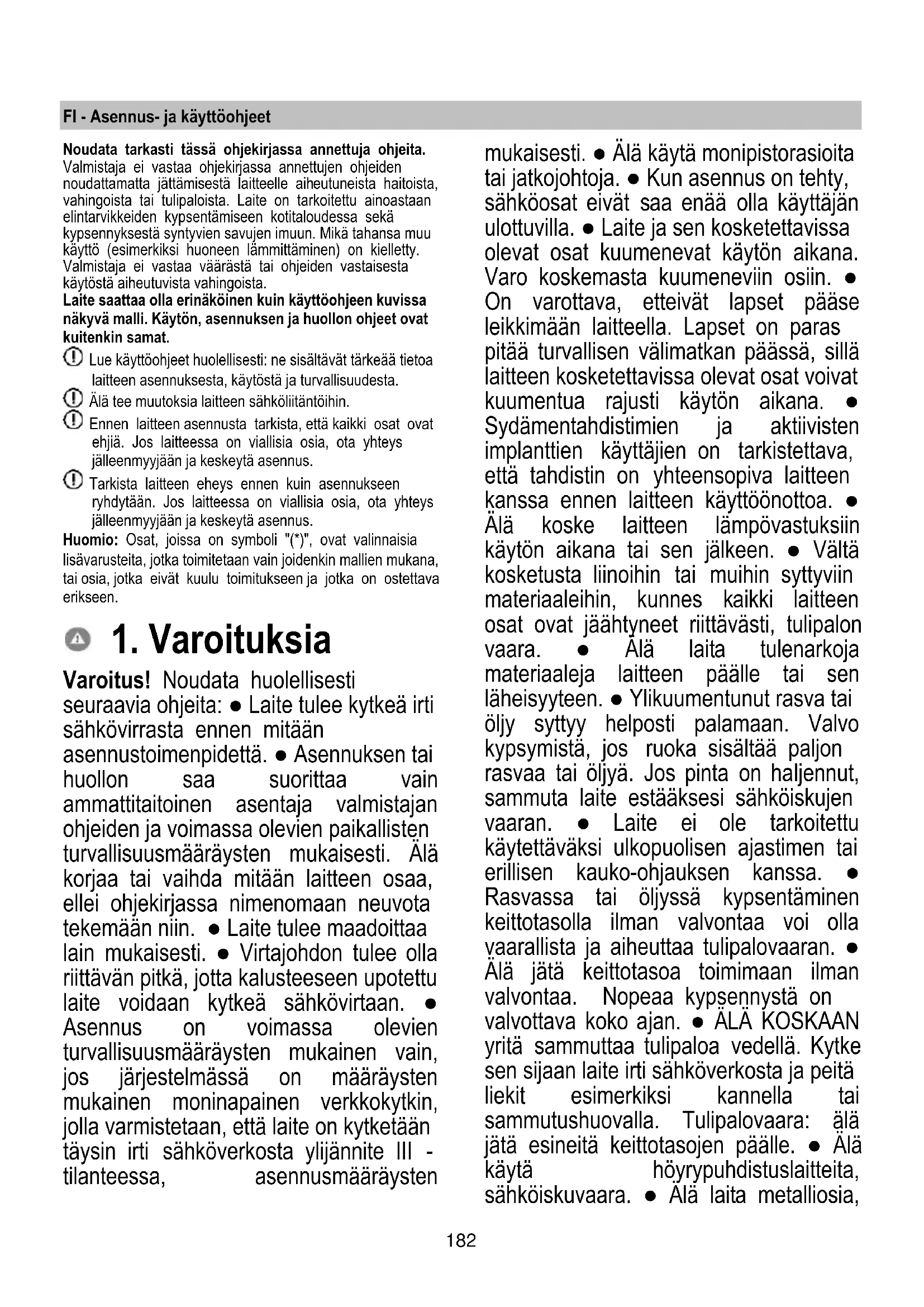 Varoitus! Noudata huolellisesti seuraavia ohjeita: ● Laite tulee kytkeä irti sähkövirrasta ennen mitään asennustoimenpidettä. ● Asennuksen tai huollon saa suorittaa vain ammattitaitoinen asentaja valmistajan ohjeiden ja voimassa olevien paikallisten turvallisuusmääräysten mukaisesti. Älä korjaa tai vaihda mitään laitteen osaa, ellei ohjekirjassa nimenomaan neuvota tekemään niin. ● Laite tulee maadoittaa lain mukaisesti. ● Virtajohdon tulee olla riittävän pitkä, jotta kalusteeseen upotettu laite voidaan kytkeä sähkövirtaan. ● Asennus on voimassa olevien turvallisuusmääräysten mukainen vain, jos järjestelmässä on määräysten mukainen moninapainen verkkokytkin, jolla varmistetaan, että laite on kytketään täysin irti sähköverkosta ylijännite III - tilanteessa, asennusmääräysten mukaisesti. ● Älä käytä monipistorasioita tai jatkojohtoja. ● Kun asennus on tehty, sähköosat eivät saa enää olla käyttäjän ulottuvilla. ● Laite ja sen kosketettavissa olevat osat kuumenevat käytön aikana. Varo koskemasta kuumeneviin osiin. ● On varottava, etteivät lapset pääse leikkimään laitteella. Lapset on paras pitää turvallisen välimatkan päässä, sillä laitteen kosketettavissa olevat osat voivat kuumentua rajusti käytön aikana. ● Sydämentahdistimien ja aktiivisten implanttien käyttäjien on tarkistettava, että tahdistin on yhteensopiva laitteen kanssa ennen laitteen käyttöönottoa. ● Älä koske laitteen lämpövastuksiin käytön aikana tai sen jälkeen. ● Vältä kosketusta liinoihin tai muihin syttyviin materiaaleihin, kunnes kaikki laitteen osat ovat jäähtyneet riittävästi, tulipalon vaara. ● Älä laita tulenarkoja materiaaleja laitteen päälle tai sen läheisyyteen. ● Ylikuumentunut rasva tai öljy syttyy helposti palamaan. Valvo kypsymistä, jos ruoka sisältää paljon rasvaa tai öljyä. Jos pinta on haljennut, sammuta laite estääksesi sähköiskujen vaaran. ● Laite ei ole tarkoitettu käytettäväksi ulkopuolisen ajastimen tai erillisen kauko-ohjauksen kanssa. ● Rasvassa tai öljyssä kypsentäminen keittotasolla ilman valvontaa voi olla vaarallista ja aiheuttaa tulipalovaaran. ● Älä jätä keittotasoa toimimaan ilman valvontaa. Nopeaa kypsennystä on valvottava koko ajan. ● ÄLÄ KOSKAAN yritä sammuttaa tulipaloa vedellä. Kytke sen sijaan laite irti sähköverkosta ja peitä liekit esimerkiksi kannella tai sammutushuovalla. Tulipalovaara: älä jätä esineitä keittotasojen päälle. ● Älä käytä höyrypuhdistuslaitteita, sähköiskuvaara. ● Älä laita metalliosia,183 kuten veitsiä, haarukoita, lusikoita ja kansia keittotasolle, sillä ne saattavat ylikuumentua. ● Ennen kuin laite kytketään sähköverkkoon, tarkista tuotekilvestä (joka sijaitsee laitteen alaosassa), että sähköverkon jännite ja teho soveltuvat laitteeseen, ja varmista liitäntäpistorasian soveltuvuus. Epäselvissä tapauksissa ota yhteyttä pätevään sähköasentajaan. Tärkeää: ● Kytke keittotaso pois päältä käytön jälkeen sen omasta kytkimestä. Älä luota puuttuvista kattiloista kertoviin merkkivaloihin. ● Vältä nesteiden ylikiehumista. Kun keität tai lämmität nesteitä, alenna lämpöä. ● Älä jätä keittotasoa päälle käyttämättömänä, äläkä myöskään jätä tyhjiä keittoastioita kuumalle keittotasolle. ● Kun kypsennys on valmis, sammuta siihen liittyvä keittoalue. ● Älä käytä kypsennyksessä koskaan alumiinifoliota äläkä aseta tasolle koskaan suoraan alumiiniin käärittyjä tuotteita. Alumiinin sulaminen vaurioittaa laitteen korjauskelvottomaksi. ● Älä koskaan lämmitä ruokaa sisältävää suljettua peltitölkkiä tai säilykepurkkia: se voi räjähtää! Tämä varoitus koskee kaikkia keittotasomalleja. ● Korkean tehon käyttö, kuten Booster-toiminto, ei sovellu joidenkin nesteiden, kuten friteerausöljyn, kuumentamiseen. Liiallinen kuumuus voi olla vaarallista. Näissä tapauksissa on suositeltavaa käyttää pienempää tehoa. ● Keittoastiat tulee asettaa keittotasolle, ja niiden on oltava tason keskellä. Älä missään tapauksessa aseta muita esineitä kattilan ja keittotason väliin. ● Korkeissa lämpötiloissa laite vähentää automaattisesti keittoalueiden tehoa. ● Ennen minkä tahansa puhdistus● tai huoltotoimenpiteen suorittamista, kytke laite irti sähköverkosta irrottamalla pistoke tai kytkemällä huoneiston pääkatkaisin pois päältä. ● Kaikkien asennukseen ja huoltoon liittyvien toimenpiteiden aikana suojaa kädet työkäsineillä. ● Laitteen käyttö on sallittu vähintään 8-vuotiaille lapsille ja sellaisille henkilöille, joiden fyysinen, aisteihin liittyvä tai henkinen toimintakyky on rajoittunut tai joilla ei ole kokemusta tai tietoa laitteen käytöstä sillä ehdolla, että heitä valvotaan ja opastetaan laitteen turvalliseen käyttöön liittyen ja että he tuntevat sen käyttöön liittyvät vaarat. ● Lapsia on valvottava sen varmistamiseksi, etteivät he leiki laitteella. ● Lapset eivät saa suorittaa puhdistusta ja huoltoa ilman valvontaa. ● Kun laitetta käytetään samanaikaisesti muiden kaasua tai muita polttoaineita käyttävien laitteiden kanssa, huoneessa on oltava riittävä tuuletus. ● Laite tulee puhdistaa usein sekä sisä● että ulkopuolelta (VÄHINTÄÄN KERRAN KUUKAUDESSA), noudattamalla joka tapauksessa huolto-ohjeessa nimenomaisesti annettuja aikoja. ● Laitteen puhdistukseen ja sekä suodattimien puhdistukseen ja vaihtoon kuuluvien ohjeiden noudattamatta jättäminen aiheuttaa tulipalovaaran. ● Ruokien liekittäminen on ehdottomasti kiellettyä. ● Avotulen käyttö on vahingollista suodattimille ja voi aiheuttaa tulipaloja. Näin ollen sen käyttöä on vältettävä joka tapauksessa. ● Friteerausta on valvottava jatkuvasti, jotta voidaan välttää ylikuumentuneen öljyn syttyminen. ● VAROITUS: Kun keittotaso on toiminnassa, laitteen kosketettavat osat vo