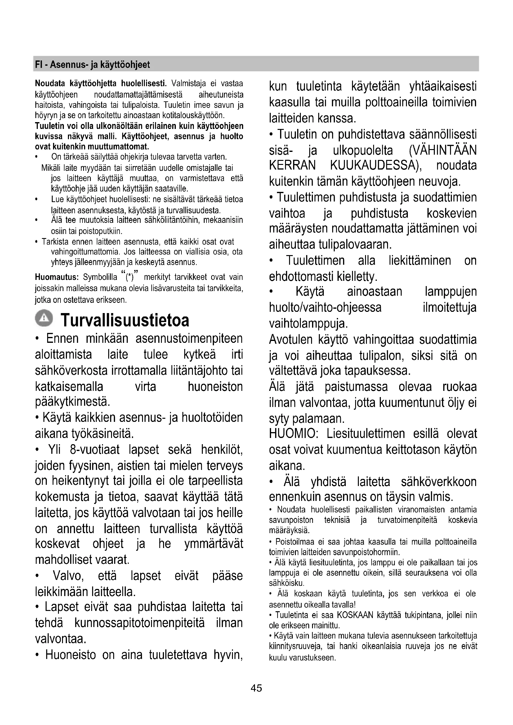 - Huoneisto on aina tuuletettava hyvin, kun tuuletinta käytetään yhtäaikaisesti kaasulla tai muilla polttoaineilla toimivien laitteiden kanssa.