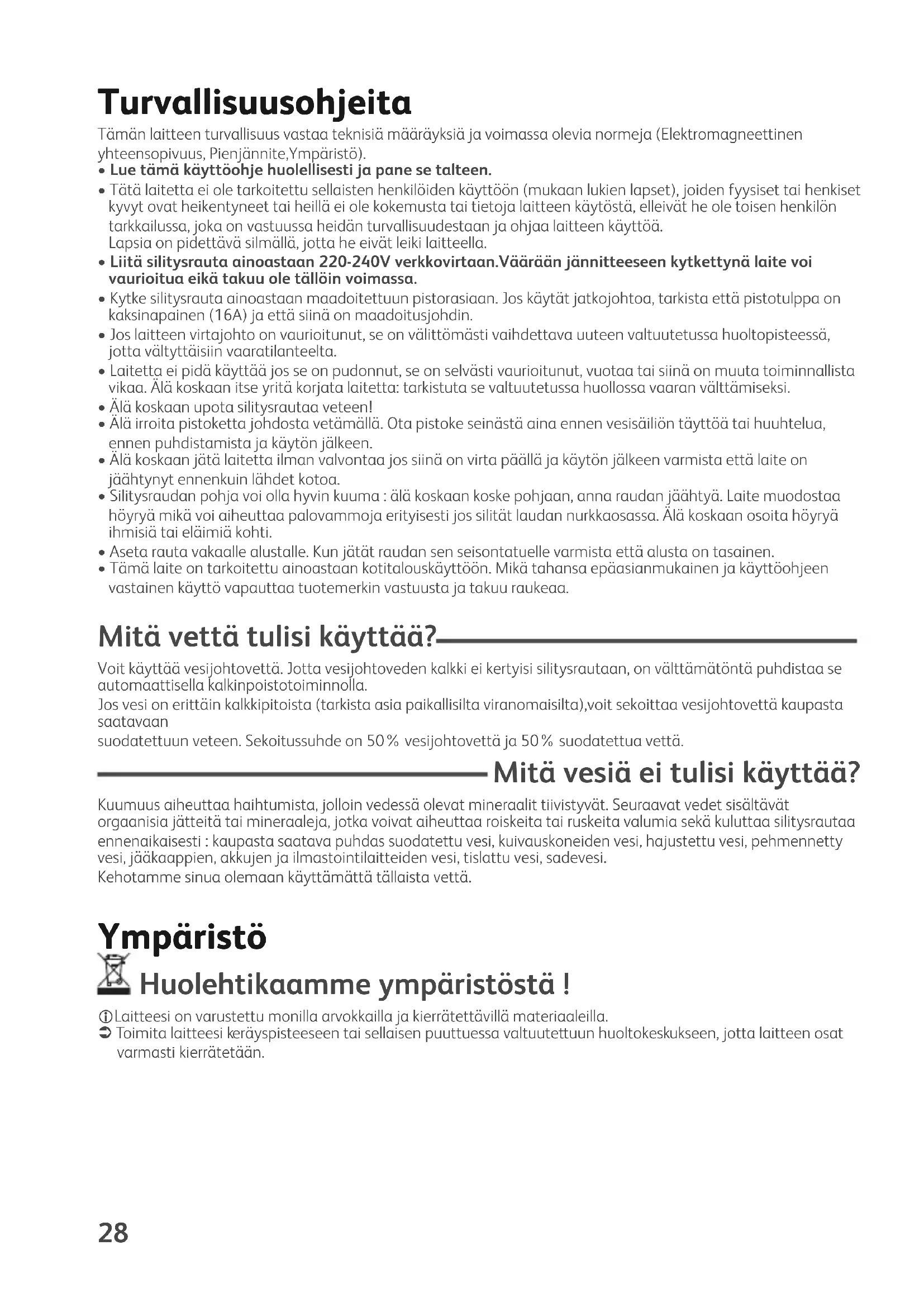 - Tämä laite on tarkoitettu ainoastaan kotitalouskäyttöön. Mikä tahansa epäasianmukainen ja käyttöohjeen vastainen käyttö vapauttaa tuotemerkin vastuusta ja takuu raukeaa. Mitä vettä tulisi käyttää? Voit käyttää vesijohtovettä. Jotta vesijohtoveden kalkki ei kertyisi silitysrautaan, on välttämätöntä puhdistaa se automaattisella kalkinpoistotoiminnolla. Jos vesi on erittäin kalkkipitoista (tarkista asia paikallisilta viranomaisilta),voit sekoittaa vesijohtovettä kaupasta saatavaan suodatettuun veteen. Sekoitussuhde on 50% vesijohtovettä ja 50% suodatettua vettä. Mitä vesiä ei tulisi käyttää? Kuumuus aiheuttaa haihtumista, jolloin vedessä olevat mineraalit tiivistyvät. Seuraavat vedet sisältävät orgaanisia jätteitä tai mineraaleja, jotka voivat aiheuttaa roiskeita tai ruskeita valumia sekä kuluttaa silitysrautaa ennenaikaisesti : kaupasta saatava puhdas suodatettu vesi, kuivauskoneiden vesi, hajustettu vesi, pehmennetty vesi, jääkaappien, akkujen ja ilmastointilaitteiden vesi, tislattu vesi, sadevesi. Kehotamme sinua olemaan käyttämättä tällaista vettä. Ympäristö Huolehtikaamme ympäristöstä ! i Laitteesi on varustettu monilla arvokkailla ja kierrätettävillä materiaaleilla. ‹ Toimita laitteesi keräyspisteeseen tai sellaisen puuttuessa valtuutettuun huoltokeskukseen, jotta laitteen osat varmasti kierrätetään. 1800122999 FV1140 T0-Y0_110x154 MO 02/09/11 09:23 Page28EN