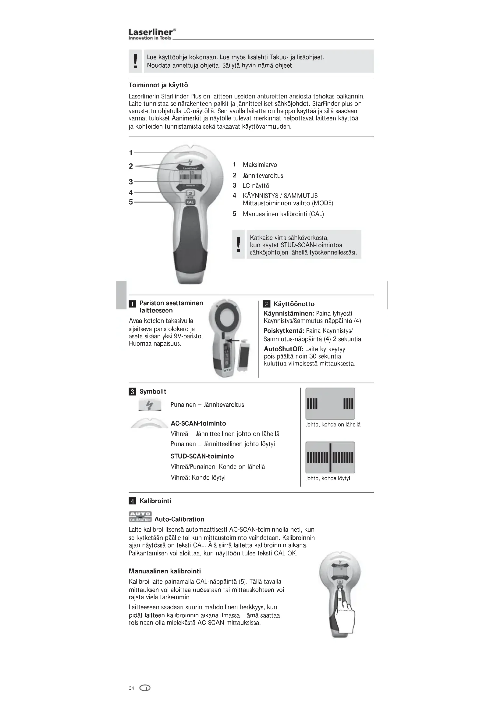 Mittaustoiminnon vaihto (MODE) Manuaalinen kalibrointi (CAL) Avaa kotelon takasivulla sijaitseva paristolokero ja aseta sisään yksi 9V-paristo. Huomaa napaisuus. Pariston asettaminen laitteeseen Käynnistäminen: Paina lyhyesti Kaynnistys/Sammutus-näppäintä (4). Poiskytkentä: Paina Kaynnistys/ Sammutus-näppäintä (4) 2 sekuntia. AutoShutOff: Laite kytkeytyy pois päältä noin 30 sekuntia kuluttua viimeisestä mittauksesta. Käyttöönotto Auto-Calibration Laite kalibroi itsensä automaattisesti AC-SCAN-toiminnolla heti, kun se kytketään päälle tai kun mittaustoiminto vaihdetaan. Kalibroinnin ajan näytössä on teksti CAL. Älä siirrä laitetta kalibroinnin aikana. Paikantamisen voi aloittaa, kun näyttöön tulee teksti CAL OK. Kalibrointi Manuaalinen kalibrointi Kalibroi laite painamalla CAL-näppäintä (5). Tällä tavalla mittauksen voi aloittaa uudestaan tai mittauskohteen voi rajata vielä tarkemmin. Laitteeseen saadaan suurin mahdollinen herkkyys, kun pidät laitteen kalibroinnin aikana ilmassa. Tämä saattaa toisinaan olla mielekästä AC-SCAN-mittauksissa. Katkaise virta sähköverkosta, kun käytät STUD-SCAN-toimintoa sähköjohtojen lähellä työskennellessäsi.