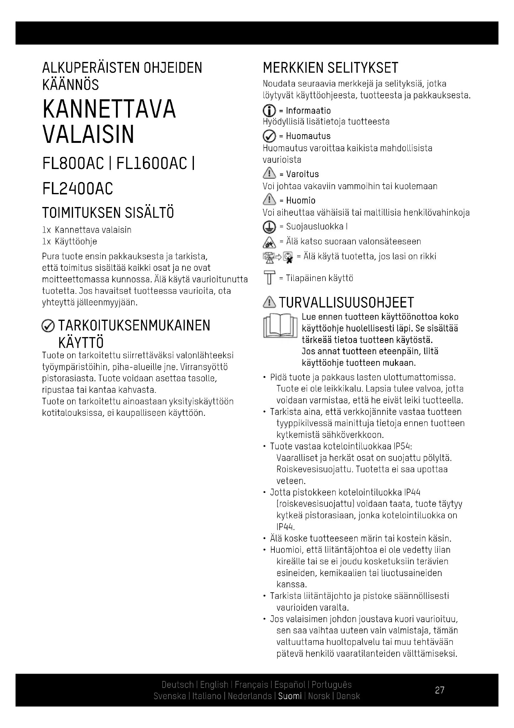 - Jos valaisimen johdon joustava kuori vaurioituu, sen saa vaihtaa uuteen vain valmistaja, tämän valtuuttama huoltopalvelu tai muu tehtävään pätevä henkilö vaaratilanteiden välttämiseksi.Deutsch | English | Français | Español | Português Svenska | Italiano | Nederlands | Suomi | Norsk | Dansk
