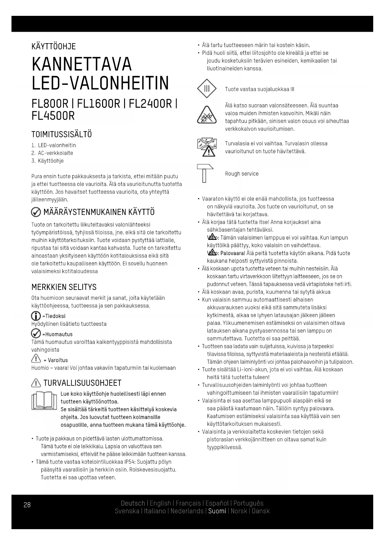 - Pidä huoli siitä, ettei liitosjohto ole kireällä ja ettei se joudu kosketuksiin terävien esineiden, kemikaalien tai liuotinaineiden kanssa. Tuote vastaa suojaluokkaa III Älä katso suoraan valonsäteeseen. Älä suuntaa valoa muiden ihmisten kasvoihin. Mikäli näin tapahtuu pitkään, sinisen valon osuus voi aiheuttaa verkkokalvon vaurioitumisen. Turvalasia ei voi vaihtaa. Turvalasin ollessa vaurioitunut on tuote hävitettävä. Rough service