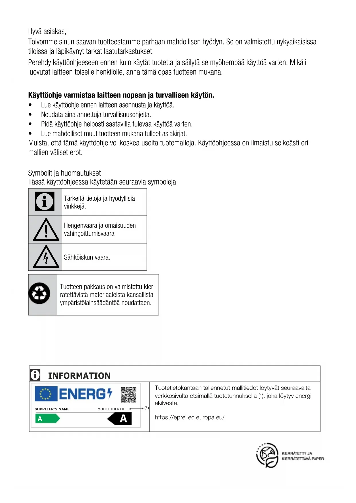 Tärkeitä tietoja ja hyödyllisiä vinkkejä. Hengenvaara ja omaisuuden vahingoittumisvaara Sähköiskun vaara.Tuotteen pakkaus on valmistettu kier-rätettävistä materiaaleista kansallista ympäristölainsäädäntöä noudattaen.Tuotetietokantaan tallennetut mallitiedot löytyvät seuraavalta verkkosivulta etsimällä tuotetunnuksella (*), joka löytyy energi-akilvestä.https://eprel.ec.europa.eu/