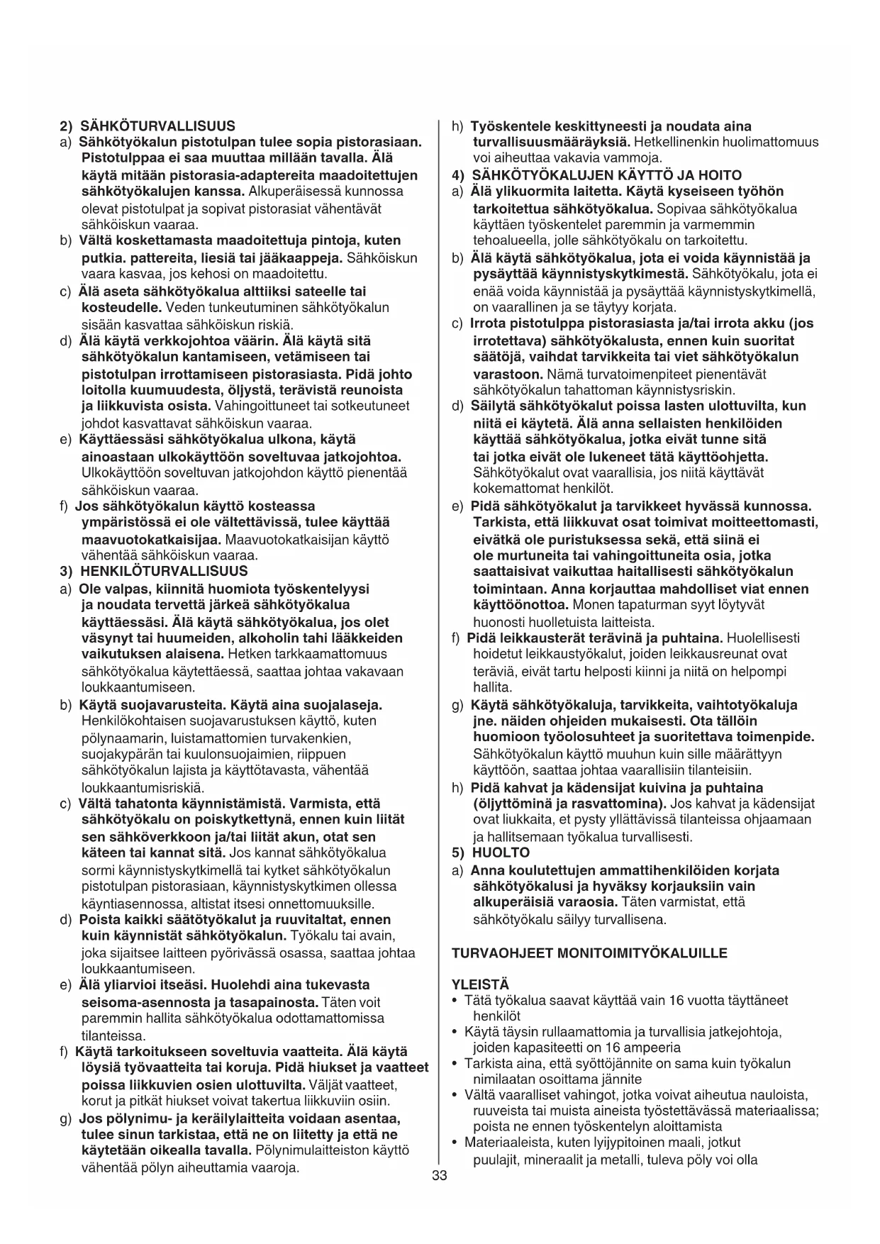 a) Älä ylikuormita laitetta. Käytä kyseiseen työhön tarkoitettua sähkötyökalua. Sopivaa sähkötyökalua käyttäen työskentelet paremmin ja varmemmin tehoalueella, jolle sähkötyökalu on tarkoitettu. b) Älä käytä sähkötyökalua, jota ei voida käynnistää ja pysäyttää käynnistyskytkimestä. Sähkötyökalu, jota ei enää voida käynnistää ja pysäyttää käynnistyskytkimellä, on vaarallinen ja se täytyy korjata. c) Irrota pistotulppa pistorasiasta ja/tai irrota akku (jos irrotettava) sähkötyökalusta, ennen kuin suoritat säätöjä, vaihdat tarvikkeita tai viet sähkötyökalun varastoon. Nämä turvatoimenpiteet pienentävät sähkötyökalun tahattoman käynnistysriskin. d) Säilytä sähkötyökalut poissa lasten ulottuvilta, kun niitä ei käytetä. Älä anna sellaisten henkilöiden käyttää sähkötyökalua, jotka eivät tunne sitä tai jotka eivät ole lukeneet tätä käyttöohjetta. Sähkötyökalut ovat vaarallisia, jos niitä käyttävät kokemattomat henkilöt. e) Pidä sähkötyökalut ja tarvikkeet hyvässä kunnossa. Tarkista, että liikkuvat osat toimivat moitteettomasti, eivätkä ole puristuksessa sekä, että siinä ei ole murtuneita tai vahingoittuneita osia, jotka saattaisivat vaikuttaa haitallisesti sähkötyökalun toimintaan. Anna korjauttaa mahdolliset viat ennen käyttöönottoa. Monen tapaturman syyt löytyvät huonosti huolletuista laitteista. f) Pidä leikkausterät terävinä ja puhtaina. Huolellisesti hoidetut leikkaustyökalut, joiden leikkausreunat ovat teräviä, eivät tartu helposti kiinni ja niitä on helpompi hallita. g) Käytä sähkötyökaluja, tarvikkeita, vaihtotyökaluja jne. näiden ohjeiden mukaisesti. Ota tällöin huomioon työolosuhteet ja suoritettava toimenpide. Sähkötyökalun käyttö muuhun kuin sille määrättyyn käyttöön, saattaa johtaa vaarallisiin tilanteisiin. h) Pidä kahvat ja kädensijat kuivina ja puhtaina (öljyttöminä ja rasvattomina). Jos kahvat ja kädensijat ovat liukkaita, et pysty yllättävissä tilanteissa ohjaamaan ja hallitsemaan työkalua turvallisesti.