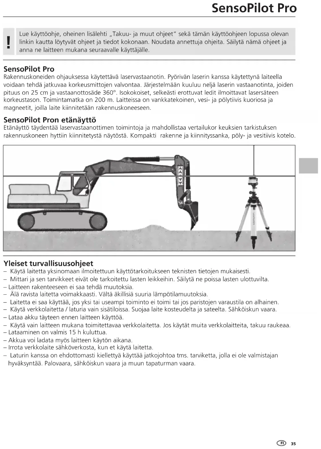 Przepisy UE i usuwanie Przyrząd spełnia wszystkie normy wymagane do wolnego obrotu towarów w UE. Produkt ten jest urządzeniem elektrycznym i zgodnie z europejską dyrektywą dotyczącą złomu elektrycznego i elektronicznego należy je zbierać i usuwać oddzielnie. Dalsze wskazówki dotyczące bezpieczeństwa i informacje dodatkowe patrz: http://laserliner.com/info?an=sesopipr Anleitung_SensoPilot_Rev18W16.indd 34 20.04.18 07:36SensoPilot Pro Rakennuskoneiden ohjauksessa käytettävä laservastaanotin. Pyörivän laserin kanssa käytettynä laiteella voidaan tehdä jatkuvaa korkeusmittojen valvontaa. Järjestelmään kuuluu neljä laserin vastaanotinta, joiden pituus on 25 cm ja vastaanottosäde 360°. Isokokoiset, selkeästi erottuvat ledit ilmoittavat lasersäteen korkeustason. Toimintamatka on 200 m. Laitteissa on vankkatekoinen, vesi- ja pölytiivis kuoriosa ja magneetit, joilla laite kiinnitetään rakennuskoneeseen. SensoPilot Pron etänäyttö Etänäyttö täydentää laservastaanottimen toimintoja ja mahdollistaa vertailukor keuksien tarkistuksen rakennuskoneen hyttiin kiinnitetystä näytöstä. Kompakti rakenne ja kiinnityssanka, pöly- ja vesitiivis kotelo. SensoPilot Pro