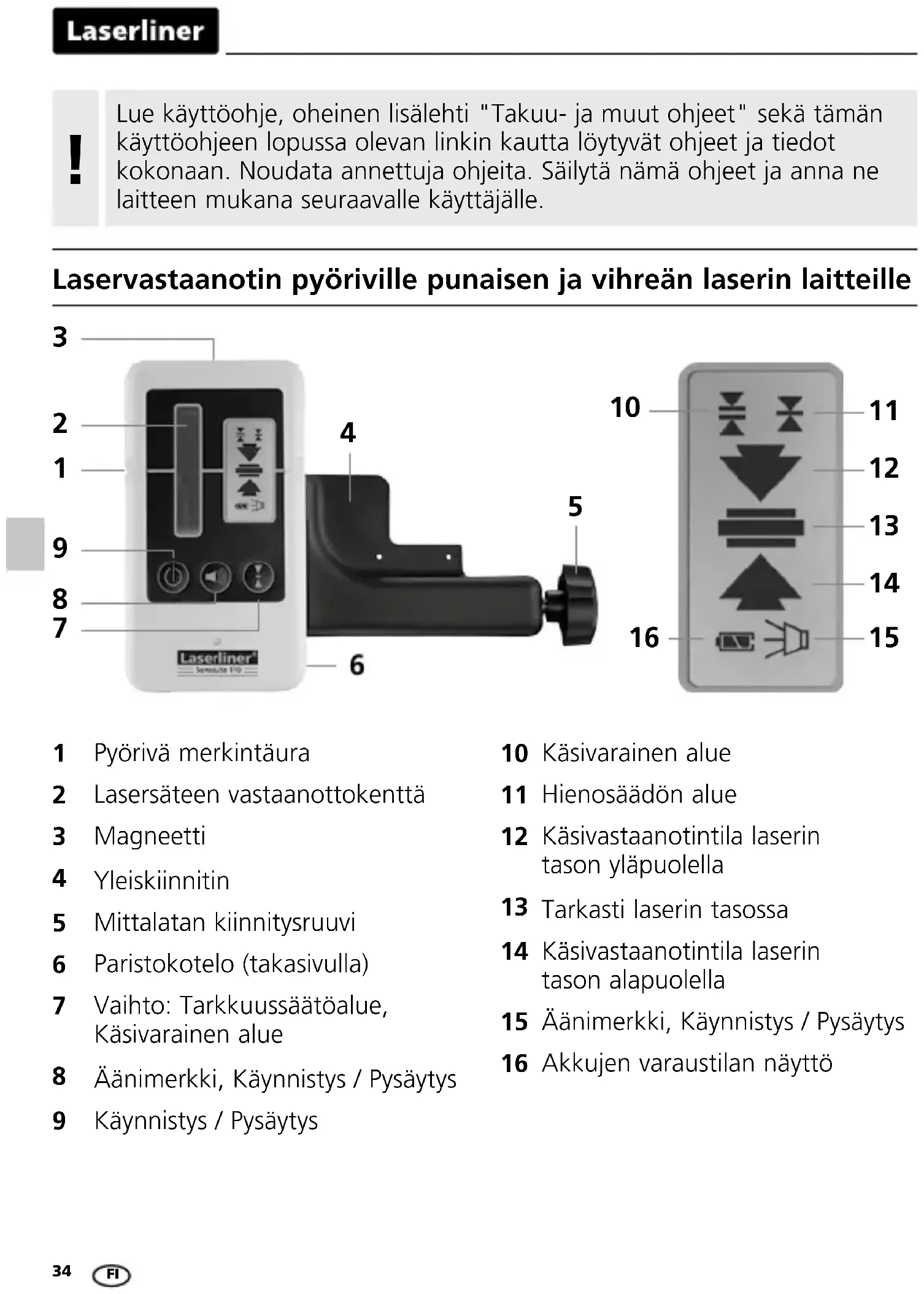 Laservastaanotin pyöriville punaisen ja vihreän laserin laitteille Pyörivä merkintäura Lasersäteen vastaanottokenttä Magneetti Yleiskiinnitin Mittalatan kiinnitysruuvi Paristokotelo (takasivulla) Vaihto: Tarkkuussäätöalue, Käsivarainen alue Äänimerkki, Käynnistys / Pysäytys Käynnistys / Pysäytys Käsivarainen alue Hienosäädön alue Käsivastaanotintila laserin tason yläpuolella Tarkasti laserin tasossa Käsivastaanotintila laserin tason alapuolella Äänimerkki, Käynnistys / Pysäytys Akkujen varaustilan näyttö FISensoLite 110 / SensoLite 110 G