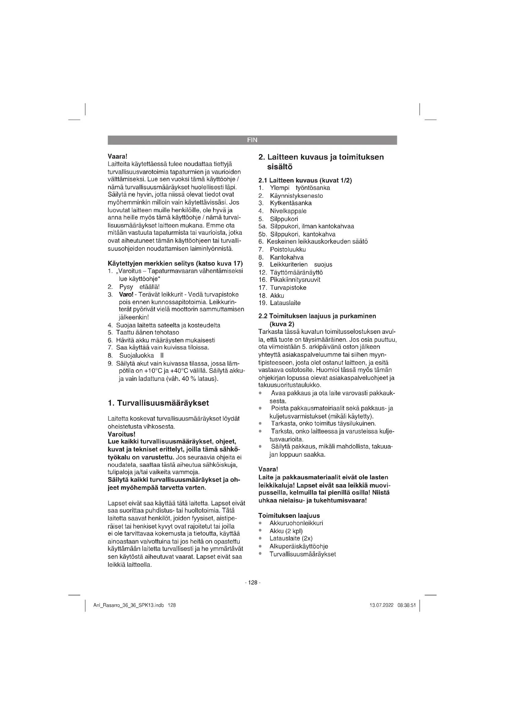 kon, josta selviävät latauslaitteen LED-näytön merkitykset. Latauksen aikana akku saattaa lämmetä hieman. Tämä on kuitenkin normaalia. Jos akkusarjan lataaminen ei onnistu, ole hyvä ja tarkasta, Anl_Rasarro_36_36_SPK13.indb 130Anl_Rasarro_36_36_SPK13.indb 130 13.07.2022 08:38:5213.07.2022 08:38:52FIN