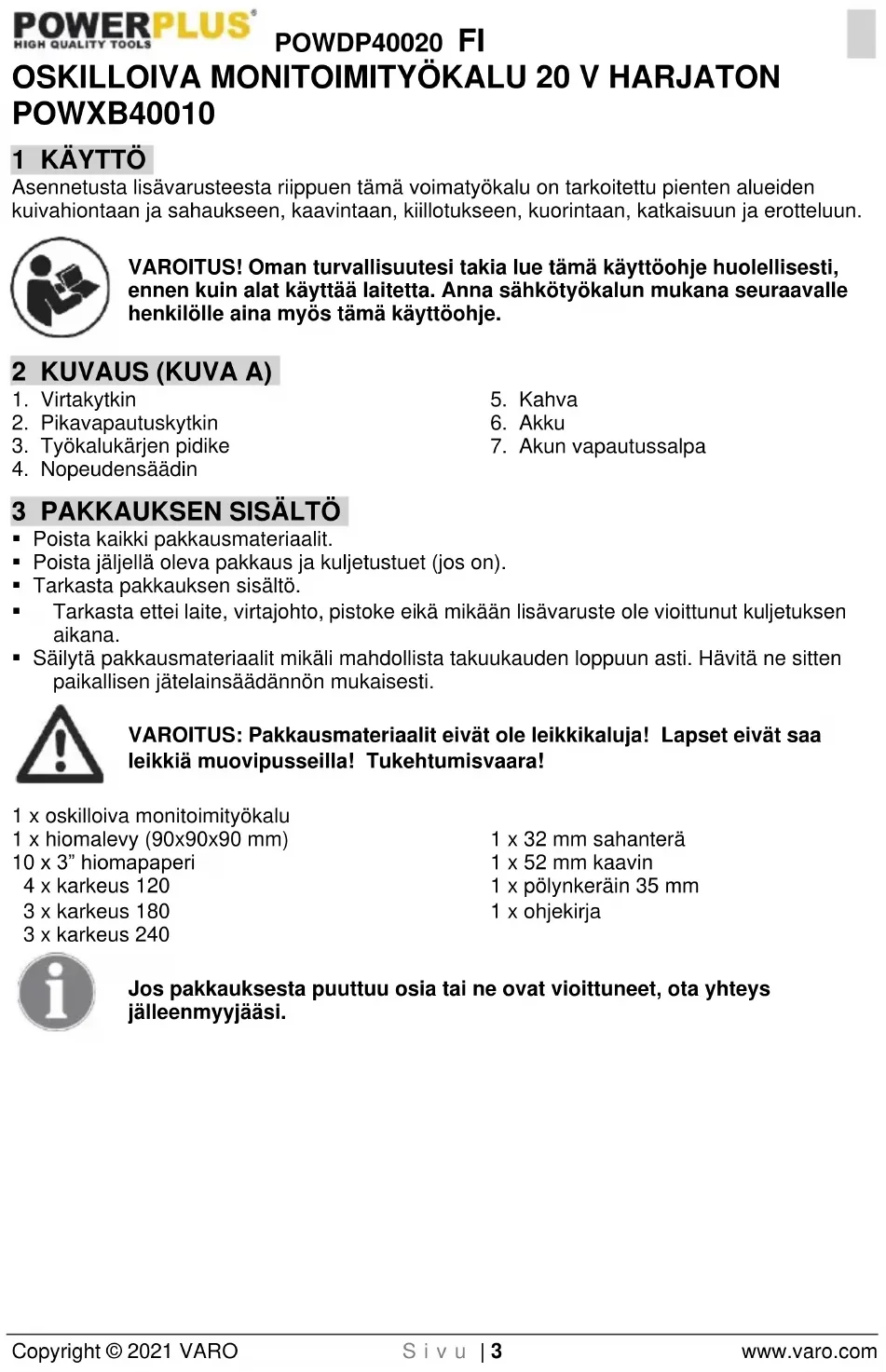 - Säilytä pakkausmateriaalit mikäli mahdollista takuukauden loppuun asti. Hävitä ne sitten paikallisen jätelainsäädännön mukaisesti. VAROITUS: Pakkausmateriaalit eivät ole leikkikaluja! Lapset eivät saa leikkiä muovipusseilla! Tukehtumisvaara! 1 x oskilloiva monitoimityökalu 1 x hiomalevy (90x90x90 mm) 10 x 3” hiomapaperi 4 x karkeus 120 3 x karkeus 180 3 x karkeus 240 1 x 32 mm sahanterä 1 x 52 mm kaavin 1 x pölynkeräin 35 mm 1 x ohjekirja Jos pakkauksesta puuttuu osia tai ne ovat vioittuneet, ota yhteys jälleenmyyjääsi.POWDP40020 FI Copyright © 2021 VARO S i v u | 4 www.varo.com 4 SYMBOLIT Seuraavia symboleja käytetään tässä ohjekirjassa ja/tai koneen päällä: