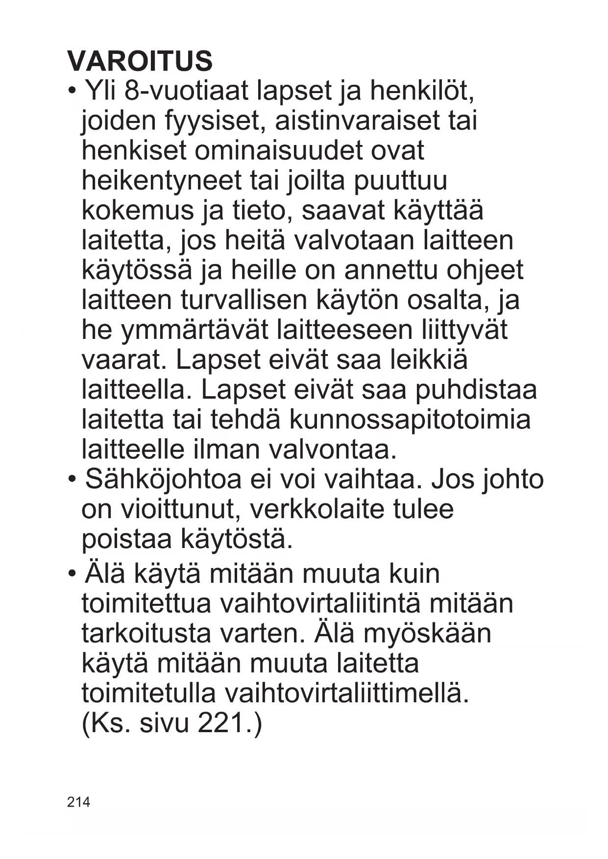 - Sähköjohtoa ei voi vaihtaa. Jos johto on vioittunut, verkkolaite tulee poistaa käytöstä.