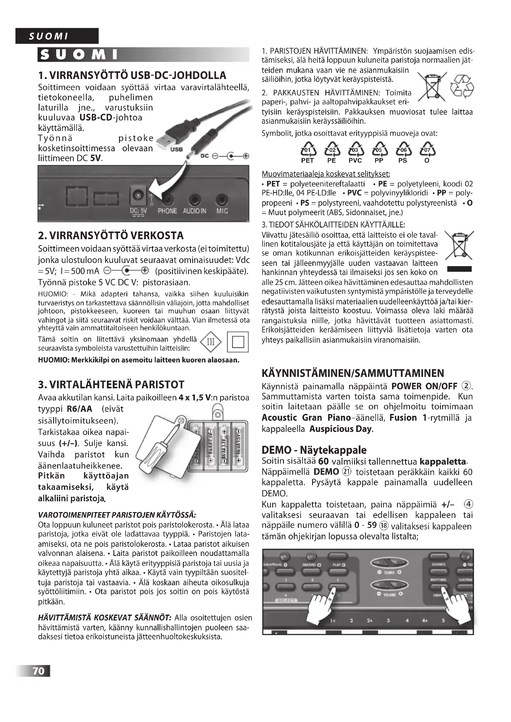 Avaa akkutilan kansi. Laita paikoilleen 4 x 1,5 V:n paristoa tyyppi R6/AA (eivät sisälly toimitukseen). Tarkistakaa oikea napai-suus (+/–). Sulje kansi. Vaihda paristot kun äänenlaatu heikkenee. Pitkän käyttöajan takaamiseksi, käytä alkaliini paristoja VAROTOIMENPITEET PARISTOJEN KÄYTÖSSÄ: Ota loppuun kuluneet paristot pois paristolokerosta. • Älä lataa paristoja, jotka eivät ole ladattavaa tyyppiä. • Paristojen lata-amiseksi, ota ne pois paristolokerosta. • Lataa paristot aikuisen valvonnan alaisena. • Laita paristot paikoilleen noudattamalla oikeaa napaisuutta. • Älä käytä erityyppisiä paristoja tai uusia ja käytettyjä paristoja yhtä aikaa. • Käytä vain tyypiltään suositel-tuja paristoja tai vastaavia. • Älä koskaan aiheuta oikosulkuja syöttöliitimiin. • Ota paristot pois jos soitin on pois käytöstä pitkään.HÄVITTÄMISTÄ KOSKEVAT SÄÄNNÖT: Alla osoitettujen osien hävittämistä varten, käänny kunnallishallintojen puoleen saa-daksesi tietoa erikoistuneista jätteenhuoltokeskuksista.1. PARISTOJEN HÄVITTÄMINEN: Ympäristön suojaamisen edis-tämiseksi, älä heitä loppuun kuluneita paristoja normaalien jät-teiden mukana vaan vie ne asianmukaisiin säiliöihin, jotka löytyvät keräyspisteistä. 2. PAKKAUSTEN HÄVITTÄMINEN: Toimita paperi-, pahvi- ja aaltopahvipakkaukset eri-tyisiin keräyspisteisiin. Pakkauksen muoviosat tulee laittaa asianmukaisiin keräyssäiliöihin. Symbolit, jotka osoittavat erityyppisiä muoveja ovat: Muovimateriaaleja koskevat selitykset:
