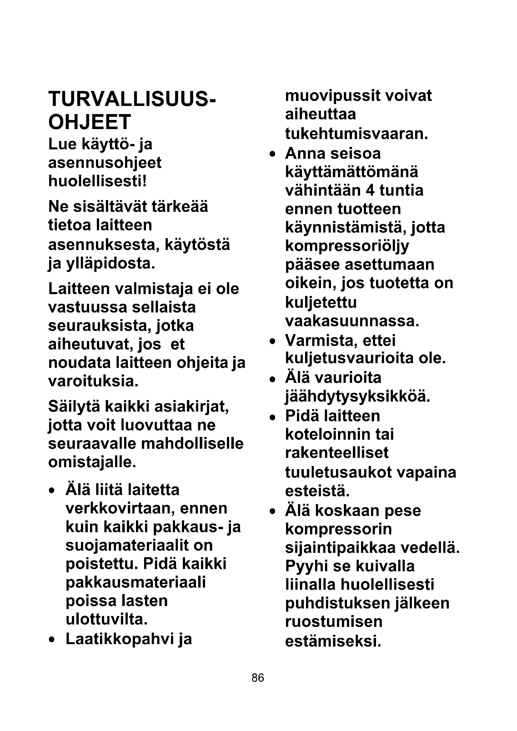Anna seisoa käyttämättömänä vähintään 4 tuntia ennen tuotteen käynnistämistä, jotta kompressoriöljy pääsee asettumaan oikein, jos tuotetta on kuljetettu vaakasuunnassa.