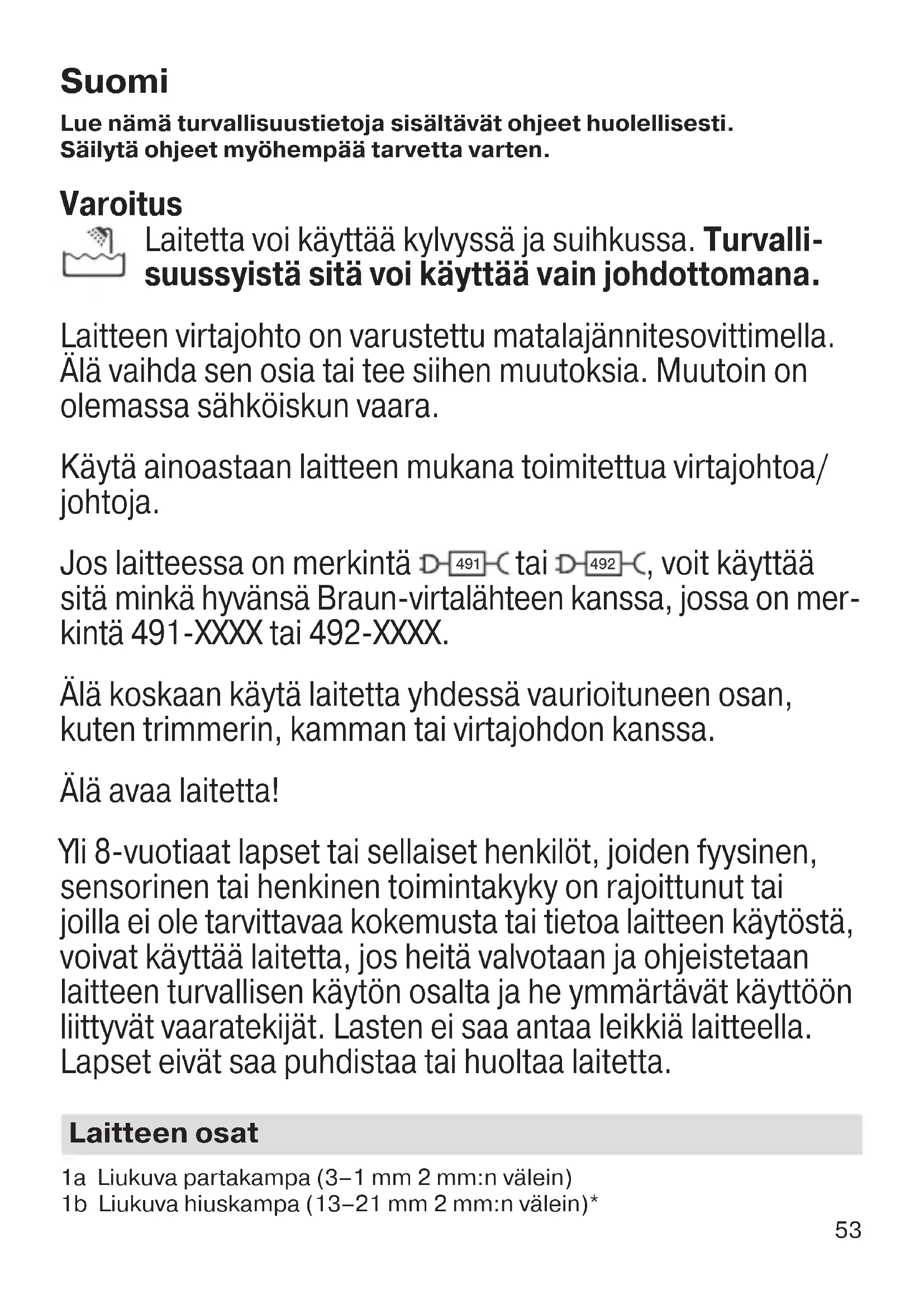 , voit käyttää sitä minkä hyvänsä Braun-virtalähteen kanssa, jossa on mer- kintä 491-XXXX tai 492-XXXX. Älä koskaan käytä laitetta yhdessä vaurioituneen osan, kuten trimmerin, kamman tai virtajohdon kanssa. Älä avaa laitetta! Yli 8-vuotiaat lapset tai sellaiset henkilöt, joiden fyysinen, sensorinen tai henkinen toimintakyky on rajoittunut tai joilla ei ole tarvittavaa kokemusta tai tietoa laitteen käytöstä, voivat käyttää laitetta, jos heitä valvotaan ja ohjeistetaan laitteen turvallisen käytön osalta ja he ymmärtävät käyttöön liittyvät vaaratekijät. Lasten ei saa antaa leikkiä laitteella. Lapset eivät saa puhdistaa tai huoltaa laitetta. Laitteen osat 1a Liukuva partakampa (3–1 mm 2 mm:n välein) 1b Liukuva hiuskampa (13–21 mm 2 mm:n välein)* 90590980_MGK7221MGK7220MGK7920MGK5280 MN_ANZ.indd 5390590980_MGK7221MGK7220MGK7920MGK5280 MN_ANZ.indd 53 11.06.19 12:0011.06.19 12:00 Business Use - P&G AUTHORIZED POA-00138563 Rev 001 Effective Date 2019-06-13 Printed 2022-03-31 Page 53 of 6454 1c Liukuvien kampojen vapautuspainike 1d Kiinteä kampa 1 (1 mm)* 1e Kiinteä kampa 2 (2 mm)* 2a Trimmeripää 2b Korva- ja nenätrimmerikärkikappale* 2c Yksityiskohtainen trimmeripää* 2d Vartalon trimmaus -kärkikappale* 2e Miniteräverkolla varustettu ajopää* 3 Virtakytkin 4 Latauksen merkkivalo 5 Virtapistoke 6 Virtajohto (ulkomuoto saattaa vaihdella) 7 Latausteline*