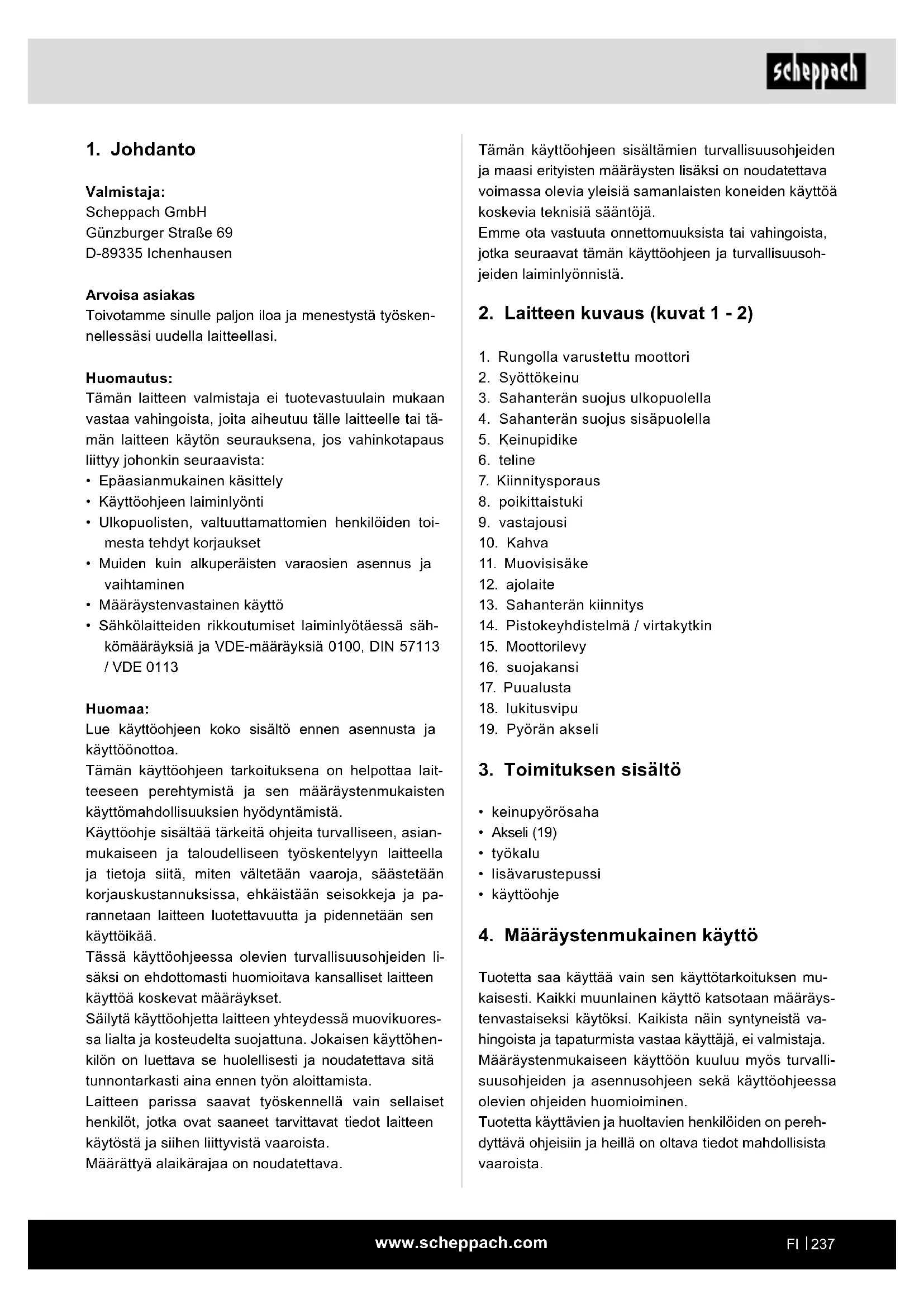 Valmistaja: Scheppach GmbH Günzburger Straße 69 D-89335 Ichenhausen Arvoisa asiakas Toivotamme sinulle paljon iloa ja menestystä työsken- nellessäsi uudella laitteellasi. Huomautus: Tämän laitteen valmistaja ei tuotevastuulain mukaan vastaa vahingoista, joita aiheutuu tälle laitteelle tai tä- män laitteen käytön seurauksena, jos vahinkotapaus liittyy johonkin seuraavista: