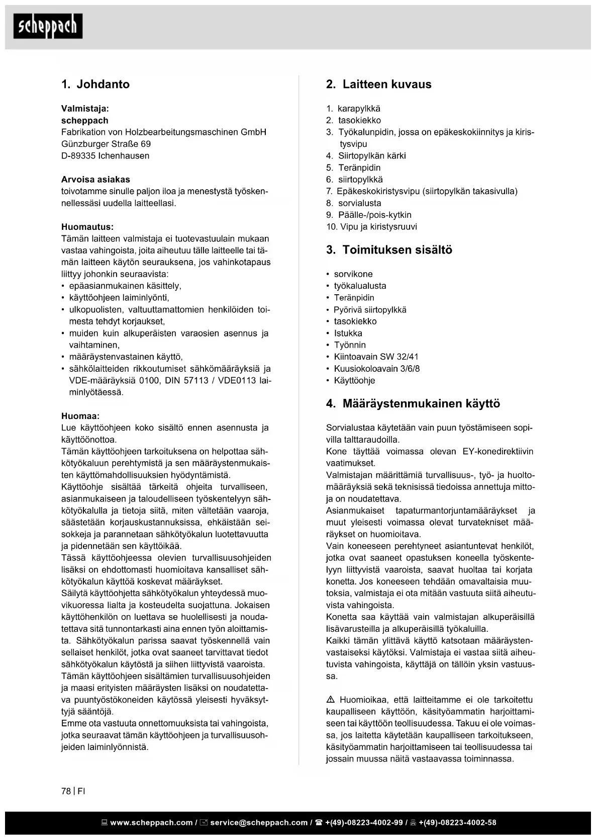- sähkölaitteiden rikkoutumiset sähkömääräyksiä ja VDE-määräyksiä 0100, DIN 57113 / VDE0113 lai- minlyötäessä. Huomaa: Lue käyttöohjeen koko sisältö ennen asennusta ja käyttöönottoa. Tämän käyttöohjeen tarkoituksena on helpottaa säh- kötyökaluun perehtymistä ja sen määräystenmukais- ten käyttömahdollisuuksien hyödyntämistä. Käyttöohje sisältää tärkeitä ohjeita turvalliseen, asianmukaiseen ja taloudelliseen työskentelyyn säh- kötyökalulla ja tietoja siitä, miten vältetään vaaroja, säästetään korjauskustannuksissa, ehkäistään sei- sokkeja ja parannetaan sähkötyökalun luotettavuutta ja pidennetään sen käyttöikää. Tässä käyttöohjeessa olevien turvallisuusohjeiden lisäksi on ehdottomasti huomioitava kansalliset säh- kötyökalun käyttöä koskevat määräykset. Säilytä käyttöohjetta sähkötyökalun yhteydessä muo- vikuoressa lialta ja kosteudelta suojattuna. Jokaisen käyttöhenkilön on luettava se huolellisesti ja nouda- tettava sitä tunnontarkasti aina ennen työn aloittamis- ta. Sähkötyökalun parissa saavat työskennellä vain sellaiset henkilöt, jotka ovat saaneet tarvittavat tiedot sähkötyökalun käytöstä ja siihen liittyvistä vaaroista. Tämän käyttöohjeen sisältämien turvallisuusohjeiden ja maasi erityisten määräysten lisäksi on noudatetta- va puuntyöstökoneiden käytössä yleisesti hyväksyt- tyjä sääntöjä. Emme ota vastuuta onnettomuuksista tai vahingoista, jotka seuraavat tämän käyttöohjeen ja turvallisuusoh- jeiden laiminlyönnistä. www.scheppach.com / service@scheppach.com / +(49)-08223-4002-99 / +(49)-08223-4002-58