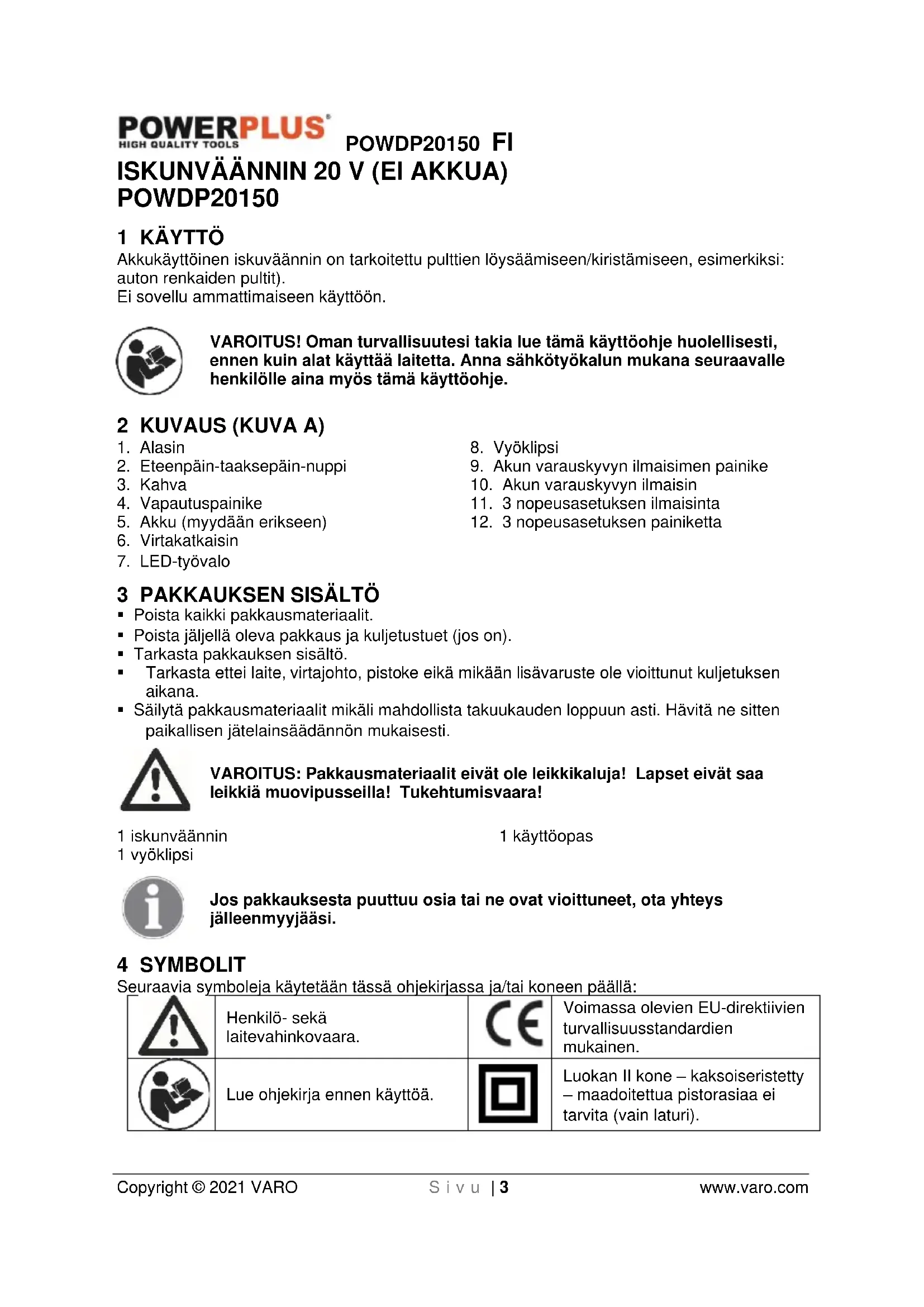 Copyright © 2021 VARO S i v u | 3 www.varo.com ISKUNVÄÄNNIN 20 V (EI AKKUA) POWDP20150 1 KÄYTTÖ Akkukäyttöinen iskuväännin on tarkoitettu pulttien löysäämiseen/kiristämiseen, esimerkiksi: auton renkaiden pultit). Ei sovellu ammattimaiseen käyttöön. VAROITUS! Oman turvallisuutesi takia lue tämä käyttöohje huolellisesti, ennen kuin alat käyttää laitetta. Anna sähkötyökalun mukana seuraavalle henkilölle aina myös tämä käyttöohje. 2 KUVAUS (KUVA A)