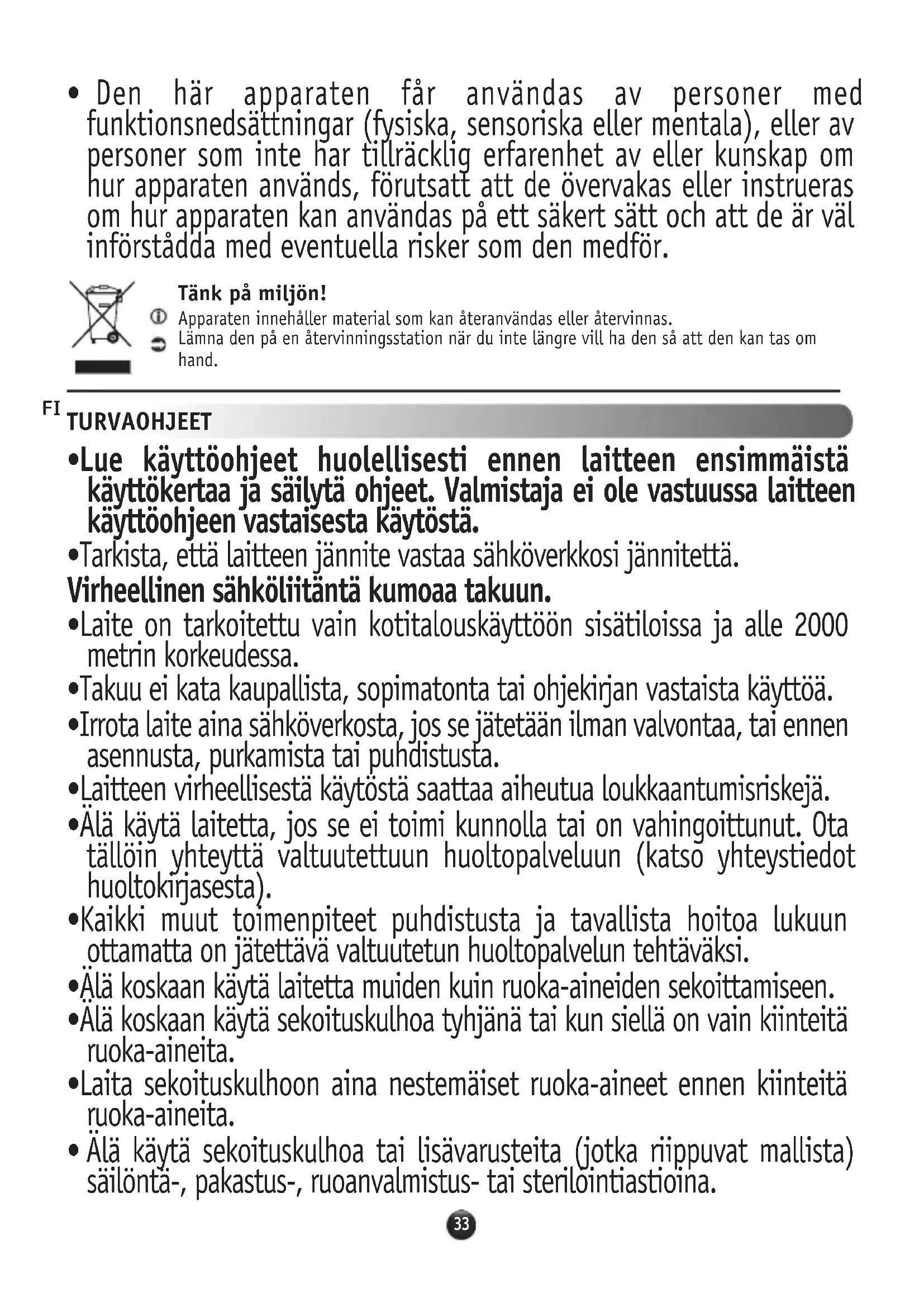 - Tätä laitetta voivat käyttää henkilöt, joiden fyysiset, aisteihin liittyvät tai henkiset kyvyt ovat rajoittuneet tai joilla ei ole riittävästi tietoa ja kokemusta, mikäli heitä valvotaan tai he ovat saaneet opastusta laitteen turvallisesta käytöstä ja jos he ymmärtävät laitteen käyttöön liittyvät riskit.36 Suojele ympäristöäsi! Laitteessa on lukuisia materiaaleja, jotka voidaan kerätä talteen tai kierrättää.Toimita laite kierrätyspisteeseen, jotta se käsitellään asianmukaisesti. SIKKERHETSINSTRUKSJONER