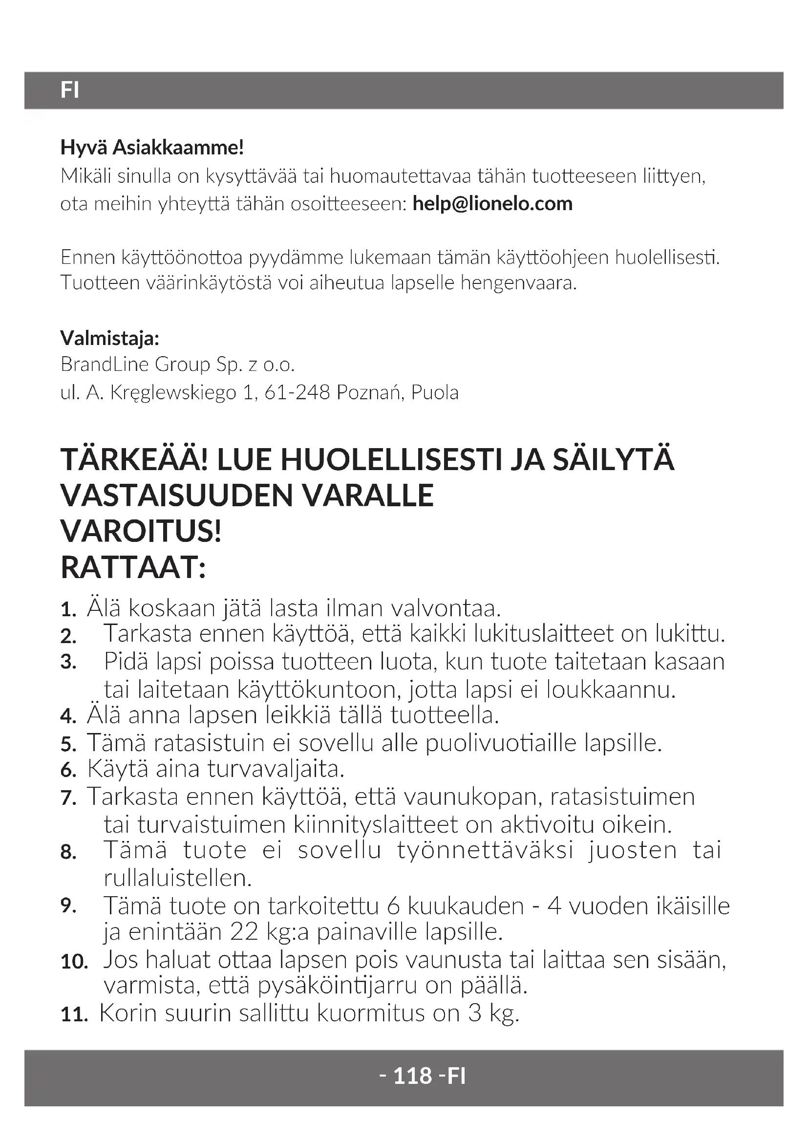 Illustraoner er kun vejledende, produkternes fakske udseende kan afvige fra udseendet vist på tegninger.‑ 118 ‑FI Hyvä Asiakkaamme! Mikäli sinulla on kysyävää tai huomauteavaa tähän tuoeeseen liiyen, ota meihin yhteyä tähän osoieeseen: help@lionelo.com Ennen käyöönooa pyydämme lukemaan tämän käyöohjeen huolellises. Tuoeen väärinkäytöstä voi aiheutua lapselle hengenvaara. Valmistaja: BrandLine Group Sp. z o.o. ul. A. Kręglewskiego 1, 61-248 Poznań, Puola TÄRKEÄÄ! LUE HUOLELLISESTI JA SÄILYTÄ VASTAISUUDEN VARALLE VAROITUS! RATTAAT: