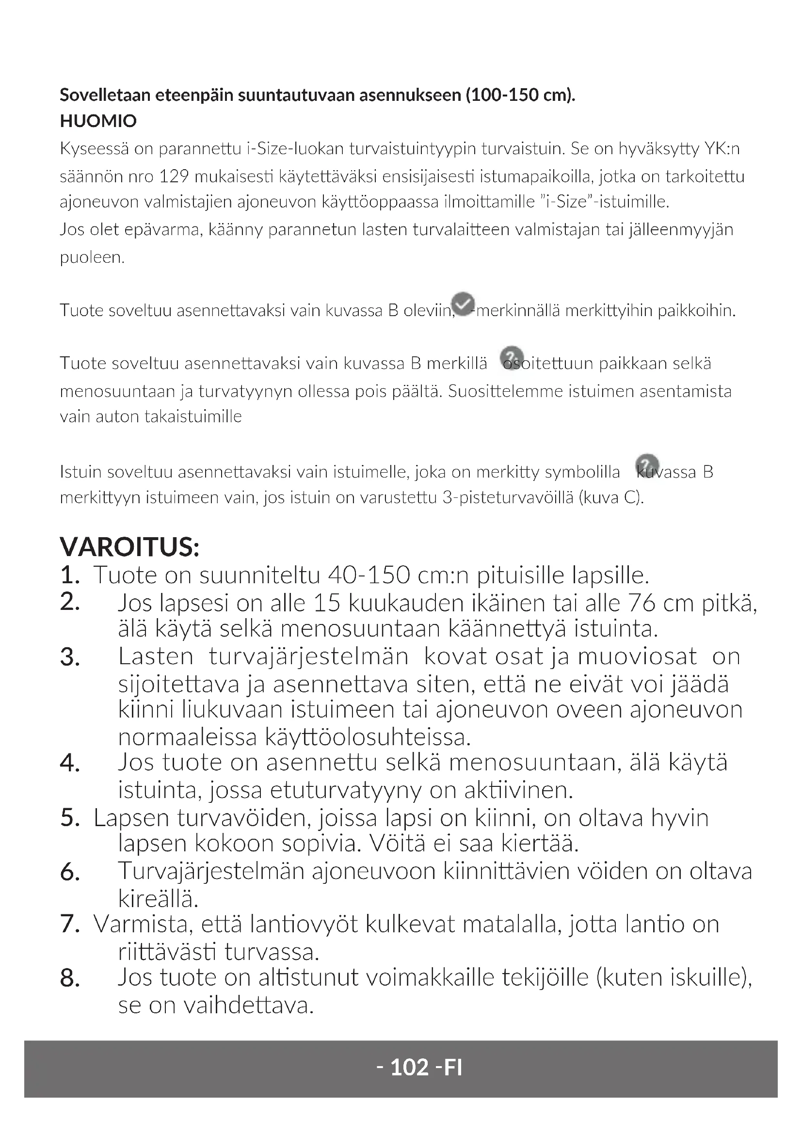 Kontroller autostolen regelmæssigt for skader. Hvis der er uregelmæssigheder, kontakt producentens serviceafdeling. Undgå at udsæe sædet for direkte sollys. Betrækket kan vaskes i varmt vand (30 C) med sæbe eller et mildt rengøringsmiddel. Tør ikke betrækket i solen. Rengør låsen, selerne og plastdelene med varmt vand. Brug ikke rengøringsmidler. Billederne er kun l illustraonsformål, og produkternes fakske udseende kan afvige fra de viste billeder. Hyvä asiakas! Jos sinulla on kommeneja tai kysymyksiä ostamastasi tuoeesta, ota meihin yhteyä: help@lionelo.com Valmistaja: BrandLine Group Sp. z o. o. o. A. Kręglewskiego 1, 61-248 Poznań, Puola Koskee taaksepäin suunnaua asennusta (40 - 105 cm). HUOMIO Kyseessä on yleismaailmallinen, hihnoilla kiinniteävä tehosteu lasten turvalaite. Se on hyväksyy YK:n säännön nro 129 mukaises käyteäväksi ensisijaises ajoneuvovalmistajien ajoneuvon omistajan käsikirjassa ilmoiamissa "yleisissä istumapaikoissa". Jos olet epävarma, käänny parannetun lasten turvalaieen valmistajan tai jälleenmyyjän puoleen. FI‑ 102 ‑FI Sovelletaan eteenpäin suuntautuvaan asennukseen (100-150 cm). HUOMIO Kyseessä on paranneu i-Size-luokan turvaistuintyypin turvaistuin. Se on hyväksyy YK:n säännön nro 129 mukaises käyteäväksi ensisijaises istumapaikoilla, jotka on tarkoiteu ajoneuvon valmistajien ajoneuvon käyöoppaassa ilmoiamille ”i-Size”-istuimille. Jos olet epävarma, käänny parannetun lasten turvalaieen valmistajan tai jälleenmyyjän puoleen. Tuote soveltuu asenneavaksi vain kuvassa B oleviin, -merkinnällä merkiyihin paikkoihin. Tuote soveltuu asenneavaksi vain kuvassa B merkillä osoiteuun paikkaan selkä menosuuntaan ja turvatyynyn ollessa pois päältä. Suosielemme istuimen asentamista vain auton takaistuimille Istuin soveltuu asenneavaksi vain istuimelle, joka on merkiy symbolilla kuvassa B merkiyyn istuimeen vain, jos istuin on varusteu 3-pisteturvavöillä (kuva C). VAROITUS: