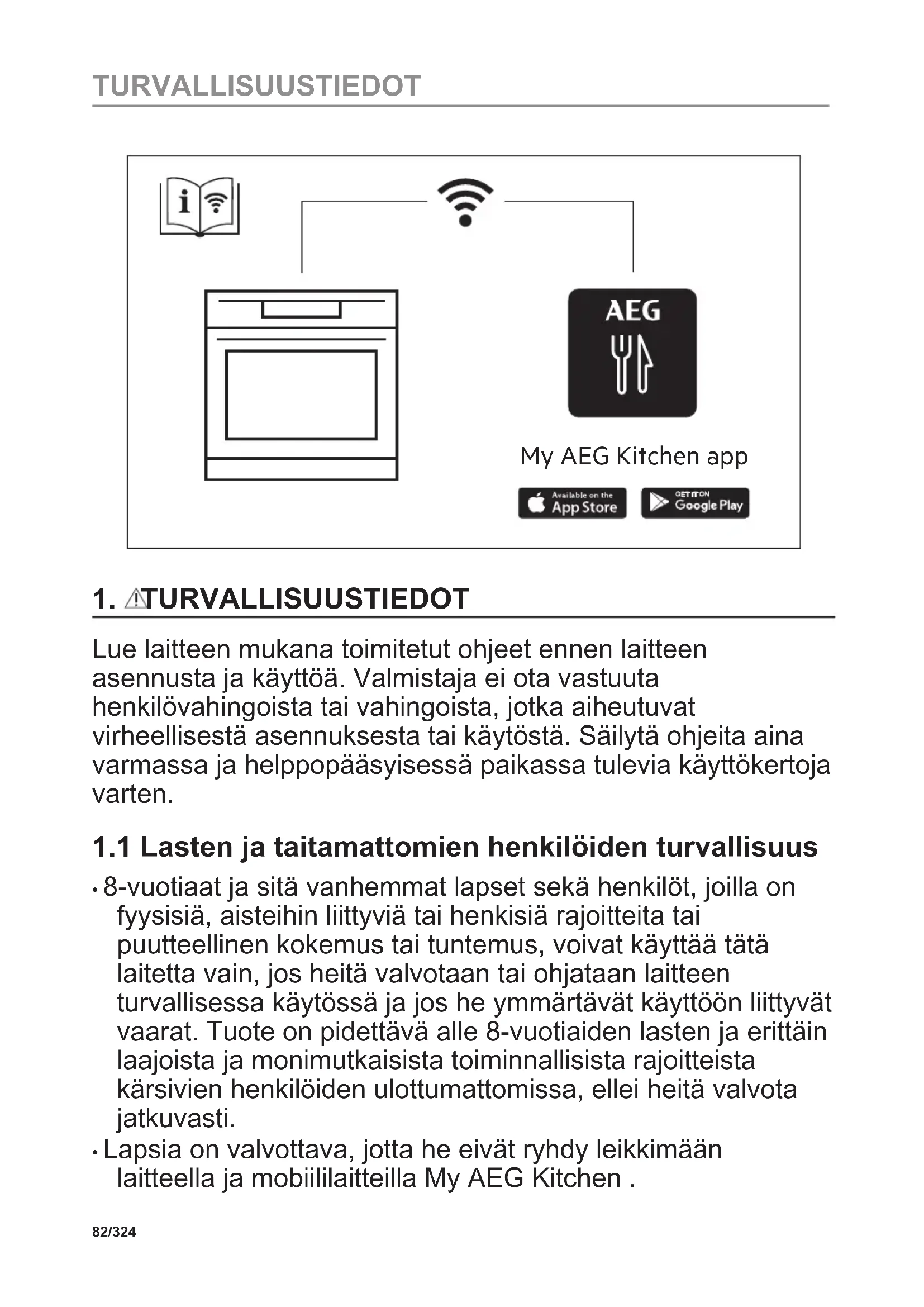 - Lapsia on valvottava, jotta he eivät ryhdy leikkimään laitteella ja mobiililaitteilla My AEG Kitchen . 82/324 TURVALLISUUSTIEDOT• Kaikki pakkaukset tulee pitää lasten ulottumattomissa ja hävittää asianmukaisesti.