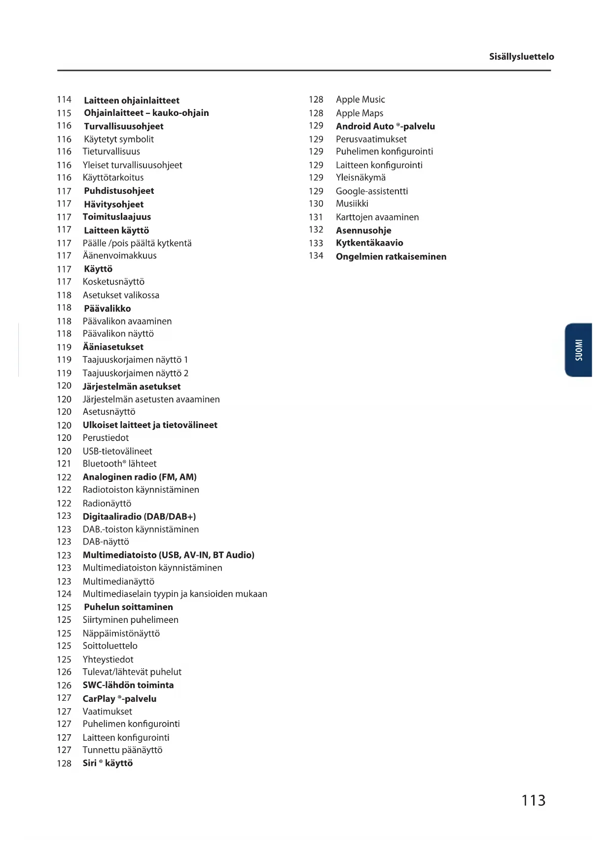 Apple Music Apple Maps Android Auto ®-palvelu Perusvaatimukset Puhelimen kongurointi Laitteen kongurointi Yleisnäkymä Google-assistentti Musiikki Karttojen avaaminen Asennusohje Kytkentäkaavio Ongelmien ratkaiseminen Sisällysluettelo SUOMI 113Laitteen ohjauksen osat
