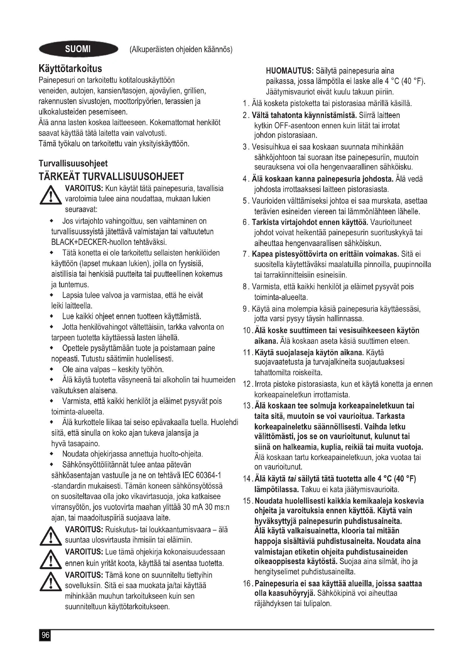 VAROITUS: Kun käytät tätä painepesuria, tavallisia varotoimia tulee aina noudattaa, mukaan lukien seuraavat: Jos virtajohto vahingoittuu, sen vaihtaminen on turvallisuussyistä jätettävä valmistajan tai valtuutetun BLACK+DECKER‑huollon tehtäväksi. Tätä konetta ei ole tarkoitettu sellaisten henkilöiden käyttöön (lapset mukaan lukien), joilla on fyysisiä, aistillisia tai henkisiä puutteita tai puutteellinen kokemus ja tuntemus. Lapsia tulee valvoa ja varmistaa, että he eivät leiki laitteella. Lue kaikki ohjeet ennen tuotteen käyttämistä. Jotta henkilövahingot vältettäisiin, tarkka valvonta on tarpeen tuotetta käyttäessä lasten lähellä. Opettele pysäyttämään tuote ja poistamaan paine nopeasti. Tutustu säätimiin huolellisesti. Ole aina valpas – keskity työhön. Älä käytä tuotetta väsyneenä tai alkoholin tai huumeiden vaikutuksen alaisena. Varmista, että kaikki henkilöt ja eläimet pysyvät pois toiminta‑alueelta. Älä kurkottele liikaa tai seiso epävakaalla tuella. Huolehdi siitä, että sinulla on koko ajan tukeva jalansija ja hyvä tasapaino. Noudata ohjekirjassa annettuja huolto‑ohjeita. Sähkönsyöttöliitännät tulee antaa pätevän sähköasentajan vastuulle ja ne on tehtävä IEC 60364‑1 ‑standardin mukaisesti. Tämän koneen sähkönsyötössä on suositeltavaa olla joko vikavirtasuoja, joka katkaisee virransyötön, jos vuotovirta maahan ylittää 30 mA 30 ms:n ajan, tai maadoituspiiriä suojaava laite.